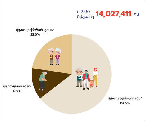 ในปี 2537 สถิติผู้สูงอายุที่อาศัยอยู่เพียงลำพัง มีเพียงร้อยละ 3.6 เท่านั้น ในขณะที่ข้อมูลการสำรวจปี 2567 ตัวเลขนี้กลับพุ่งสูงขึ้นถึง ร้อยละ 12.9 (คิดเป็นจำนวนประชากรประมาณ 1.8 ล้านคน) ความน่ากังวลไม่ได้หยุดอยู่เพียงแค่กลุ่มที่อยู่คนเดียว แต่ยังรวมถึงกลุ่มที่อาศัยอยู่ลำพังเฉพาะกับคู่สมรสด้วย ที่มีสัดส่วนสูงถึง ร้อยละ 22.6 นั่นหมายถึงว่า “ผู้สูงอายุต้องดูแลกันเอง โดยไร้ซึ่งบุตรหลานภายใต้ชายคาเดียวกัน” เมื่อรวมตัวเลขทั้งสองกลุ่มเข้าด้วยกัน (ประมาณร้อยละ 36) จะพบว่าผู้สูงอายุไทยเกือบ 1 ใน 3 ของทั้งหมด (หรือกว่า 14 ล้านคน) กำลังใช้ชีวิตในภาวะที่เสี่ยงต่อการขาดการดูแลอย่างใกล้ชิด