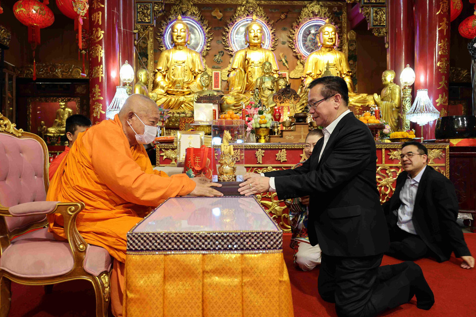 ดร.สมพร สืบถวิลกุล ประธานเจ้าหน้าที่บริหาร บริษัท ทิพย กรุ๊ป โฮลดิ้งส์ จำกัด (มหาชน) และกรรมการผู้จัดการใหญ่ บริษัท ทิพยประกันภัย จำกัด (มหาชน) พร้อมด้วยคณะผู้บริหาร เข้ากราบถวายปฏิทิน “พระพุทธนิมิตวิชิตมารโมลีศรีสรรเพชญบรมไตรโลกนาถ” หรือ “พระพุทธนิมิต” พระผู้มีชัยชนะเหนือหมู่มาร ประจำปี 2569 พร้อมถวายปัจจัยบำรุงอาราม ชุดผ้าไตรจีวร และจตุปัจจัยไทยธรรม แด่ พระคณาจารย์จีนธรรมวชิรานุวัตร (เย็นงี้) รองเจ้าคณะใหญ่จีนนิกาย เจ้าอาวาสวัดมังกรกมลาวาส (เล่งเน่ยยี่) ผู้รักษาการแทนเจ้าอาวาสวัดทิพยวารีวิหาร และผู้รักษาการแทนเจ้าอาวาสวัดบรมราชากาญจนาภิเษกอนุสรณ์ เพื่อนำไปมอบให้แก่ประชาชนและพุทธศาสนิกชน เป็นการเสริมสิริมงคล ณ วัดมังกรกมลาวาส (เล่งเน่ยยี่)