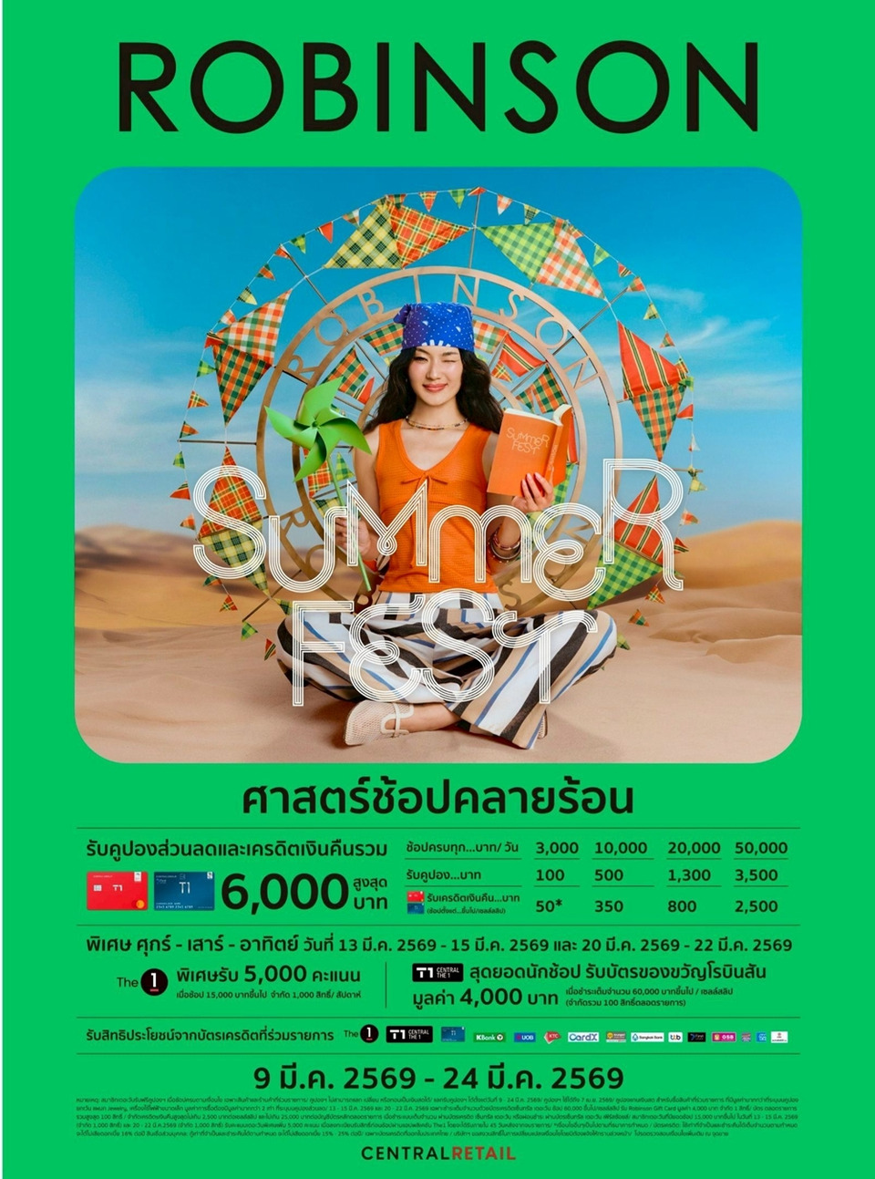 มาร่วมสัมผัส “ศาสตร์ช้อปคลายร้อน” ในแคมเปญ “ROBINSON SUMMER FEST” ระหว่างวันที่ 9 – 24 มีนาคม 2569 ที่ห้างสรรพสินค้าโรบินสันทุกสาขาทั่วประเทศ พร้อมช้อปสะดวกได้ทุกที่ทุกเวลา ผ่านหลากหลายช่องทางออนไลน์ของห้างฯ ไม่ว่าจะเป็น Robinson Chat & Shop, บริการ Robinson Personal Shopper On Demand ผู้ช่วยส่วนตัวสำหรับทุกไลฟ์สไตล์, Central App, เว็บไซต์ www.central.co.th ตลอด 24 ชั่วโมง รวมถึง Facebook Fanpage: Robinson Department Store