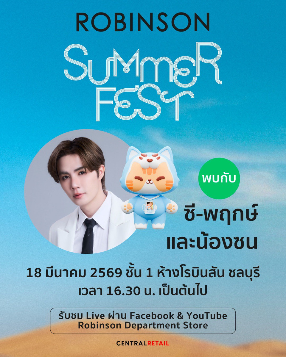 • Robinson Summer Dance Fashion Show: กิจกรรมไฮไลต์สุดร้อนแรงเปิดตัวซัมเมอร์คอลเลกชันจากแบรนด์ชั้นนำ นำทีมโดยนักแสดงสุดฮอต ซี – พฤกษ์ พร้อมสร้างสีสันความสนุกโดยมาสคอตสุดคิวต์ ‘น้องซน’ ที่จะมาร่วมดวลความมันส์กับ ‘นกโรบิ้น’ มาสคอตประจำห้าง ร่วมด้วยดาราและทัพนายแบบ - นางแบบ ในวันพุธที่ 18 มีนาคม 2569 ณ บริเวณชั้น 1 ห้างสรรพสินค้าโรบินสัน ชลบุรี