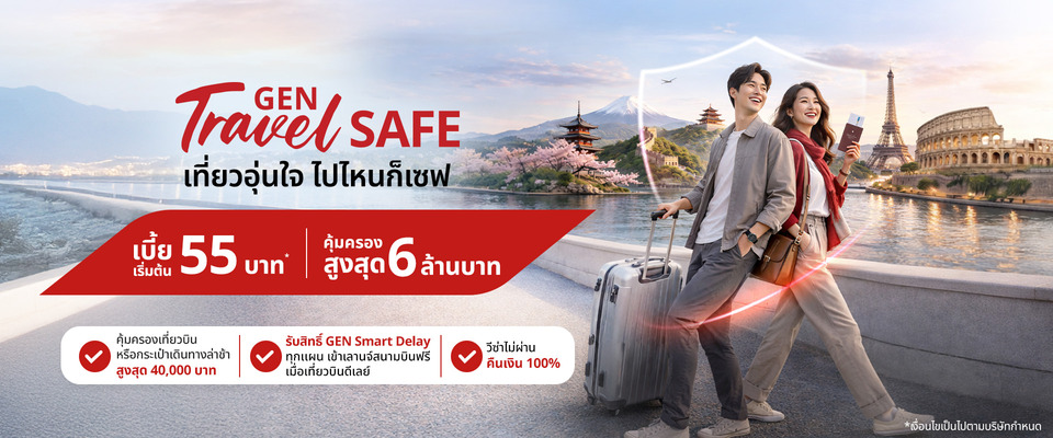 · GEN Travel Safe (เจน ทราเวล เซฟ) ประกันเดินทางออนไลน์ที่ให้ความคุ้มครองชีวิตและค่ารักษาพยาบาล ที่มีให้เลือกถึง 6 แผน ตามรูปแบบการท่องเที่ยวที่แตกต่างกัน คุ้มครองสูงสุด 6 ล้านบาท ค่าเบี้ยเริ่มต้นเพียง 55 บาท ต่อทริป หรือ เริ่มต้นเพียง 1,029 บาท แบบรายปี เพิ่มความสะดวกขึ้น สำหรับสายเดินทางตัวจริง พร้อมอัพสิทธิประโยชน์ Smart Delay ใช้บริการห้องรับรองในสนามบินเมื่อเที่ยวบินล่าช้าให้กับลูกค้าในทุกแผน รวมถึงความคุ้มครองกระเป๋าเดินทางเสียหาย และการคืนเงิน 100% หากวีซ่าไม่ผ่าน