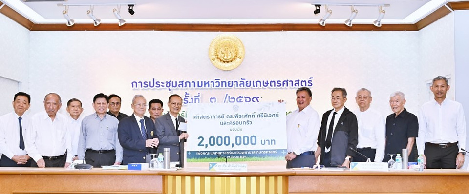 เมื่อวันที่ 23 มี.ค.69 ดร.ดำรงค์ ศรีพระราม รักษาการแทนอธิการบดีมหาวิทยาลัยเกษตรศาสตร์ รับมอบเงินบริจาค จำนวน 2,000,000 บาท เพื่อสมทบการก่อสร้างคณะแพทยศาสตร์และโรงพยาบาลเกษตรศาสตร์ จาก ศ.ดร. พีระศักดิ์ ศรีนิเวศน์ อุปนายกสภามหาวิทยาลัยเกษตรศาสตร์ และครอบครัว โดยมีกรรมการสภามหาวิทยาลัยและผู้บริหาร ร่วมเป็นสักขีพยาน ณ ห้องประชุมกำพล อดุลวิทย์ อาคารสารนิเทศ 50 ปี มหาวิทยาลัยเกษตรศาสตร์