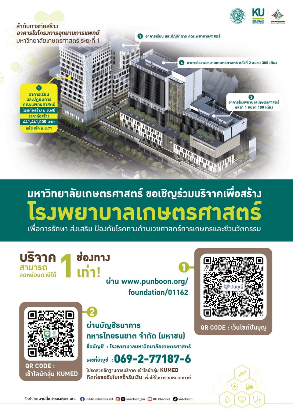 ขอเชิญชวนผู้มีจิตศรัทธาร่วมเป็นส่วนหนึ่งของการสร้างโรงพยาบาลเกษตรศาสตร์ คณะแพทยศาสตร์ คณะพยาบาลศาสตร์ คณะเภสัชศาสตร์ การร่วมแบ่งปันในวันนี้ คือพลังสำคัญในการสร้าง “โรงพยาบาลของแผ่นดิน” ที่จะดูแลสุขภาพของคนไทยในอนาคต และเป็นอีกก้าวสำคัญของมหาวิทยาลัยเกษตรศาสตร์ ในการรับใช้สังคมและประเทศชาติในทศวรรษที่ 9 โดยเงินบริจาคสามารถนำไป ลดหย่อนภาษีได้ 1 เท่า