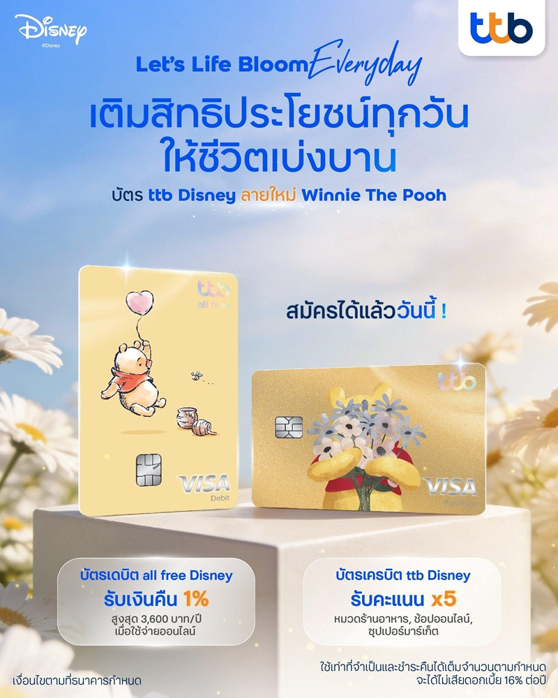 · ทีทีบี เปิดตัวดีไซน์หน้าบัตรลายใหม่ “หมีพูห์” ทั้งบัตรเดบิต ttb all free Disney ลาย “Winnie the Pooh” และบัตรเครดิต ttb Disney ลาย “Pooh Blooms” พร้อมเติมความน่ารักให้ทุกไลฟ์สไตล์การใช้จ่ายกับ e-Slip 3 ดีไซน์ใหม่ ควบคู่สิทธิประโยชน์และโปรโมชันพิเศษครบครัน โดยผู้ที่สนใจสามารถสมัครบัตรเดบิต ttb all free Disney และบัตรเครดิต ttb Disney ได้ที่แอปพลิเคชัน ttb touch และเว็บไซต์ทีทีบี หรือที่ทีทีบีทุกสาขา