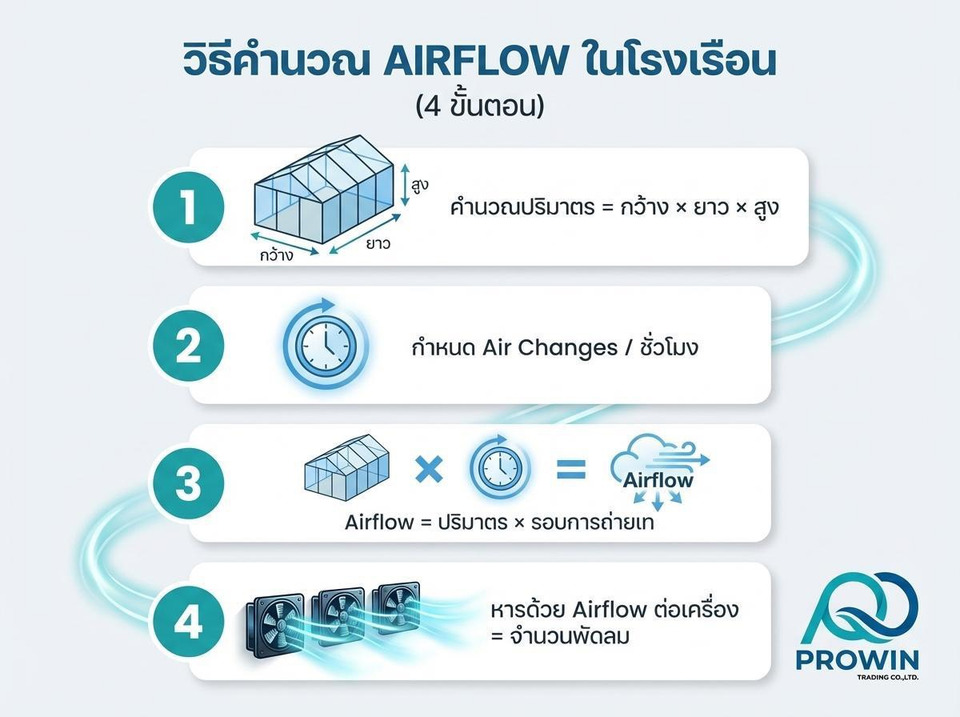 สูตรคือ: Airflow ที่ต้องใช้ต่อชั่วโมง = ปริมาตรโรงเรือน × จำนวนรอบการถ่ายเทอากาศ