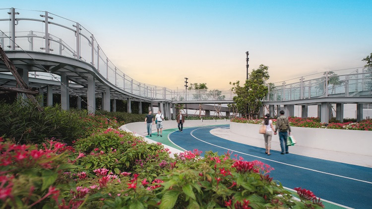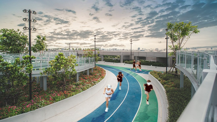 ไฮไลต์สำคัญคือพื้นที่สีเขียว 3 โซนหลัก ได้แก่ “Biophilic Garden” สวนธรรมชาติใจกลางอาคาร ช่วยลดอุณหภูมิและสร้างบรรยากาศที่ผ่อนคลาย “Multi-purpose Green Space” โซนเปิดโล่งเชื่อมอาคาร DE รองรับกิจกรรมหลากหลาย และ “Sky Garden & Track” สวนลอยฟ้าขนาดกว่า 13,000 ตารางเมตร พร้อมลู่วิ่งและทางเดินออกกำลังกาย ท่ามกลางวิวเมืองแบบพาโนรามา