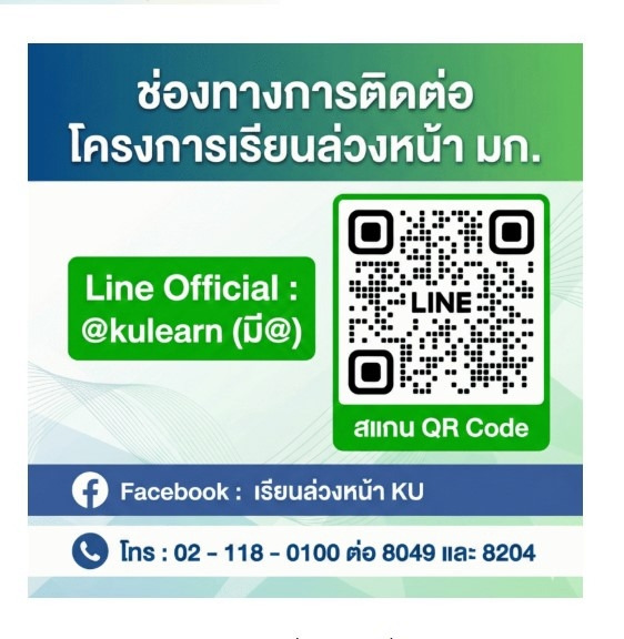 ผู้สนใจสามารถสมัครออนไลน์ได้ที่ registrar.ku.ac.th/adv หรือสอบถามข้อมูลเพิ่มเติมผ่าน Line Official: @kulearn (มี @) และ Facebook: เรียนล่วงหน้า KU