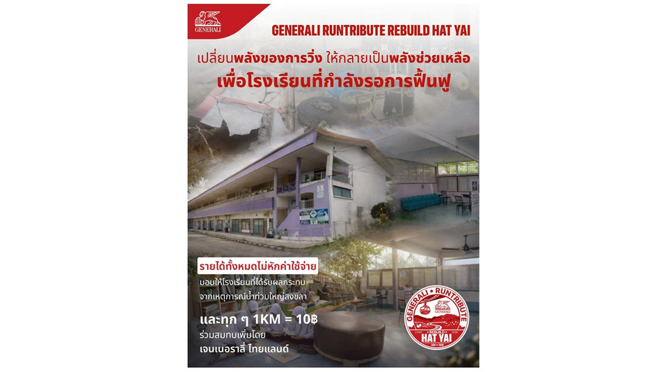 เจนเนอราลี่ ไทยแลนด์ ขอเชิญชวนประชาชนและผู้รักสุขภาพ ร่วมเป็นส่วนหนึ่งของพลังแห่งการให้ในกิจกรรม “GENERALI RUNTRIBUTE: REBUILD HAT YAI” งานวิ่งการกุศลที่จัดขึ้นเพื่อรวมพลังของนักวิ่งและคนไทยทุกคน สร้างพลังเล็ก ๆ ที่ยิ่งใหญ่ เพราะทุกก้าวของคุณคือความห่วงใย และทุกการเข้าเส้นชัย คือพลังฟื้นฟูชุมชนและส่งต่อความห่วงใยไปยังพื้นที่ที่ได้รับผลกระทบจากเหตุการณ์น้ำท่วมใหญ่ จังหวัดสงขลา