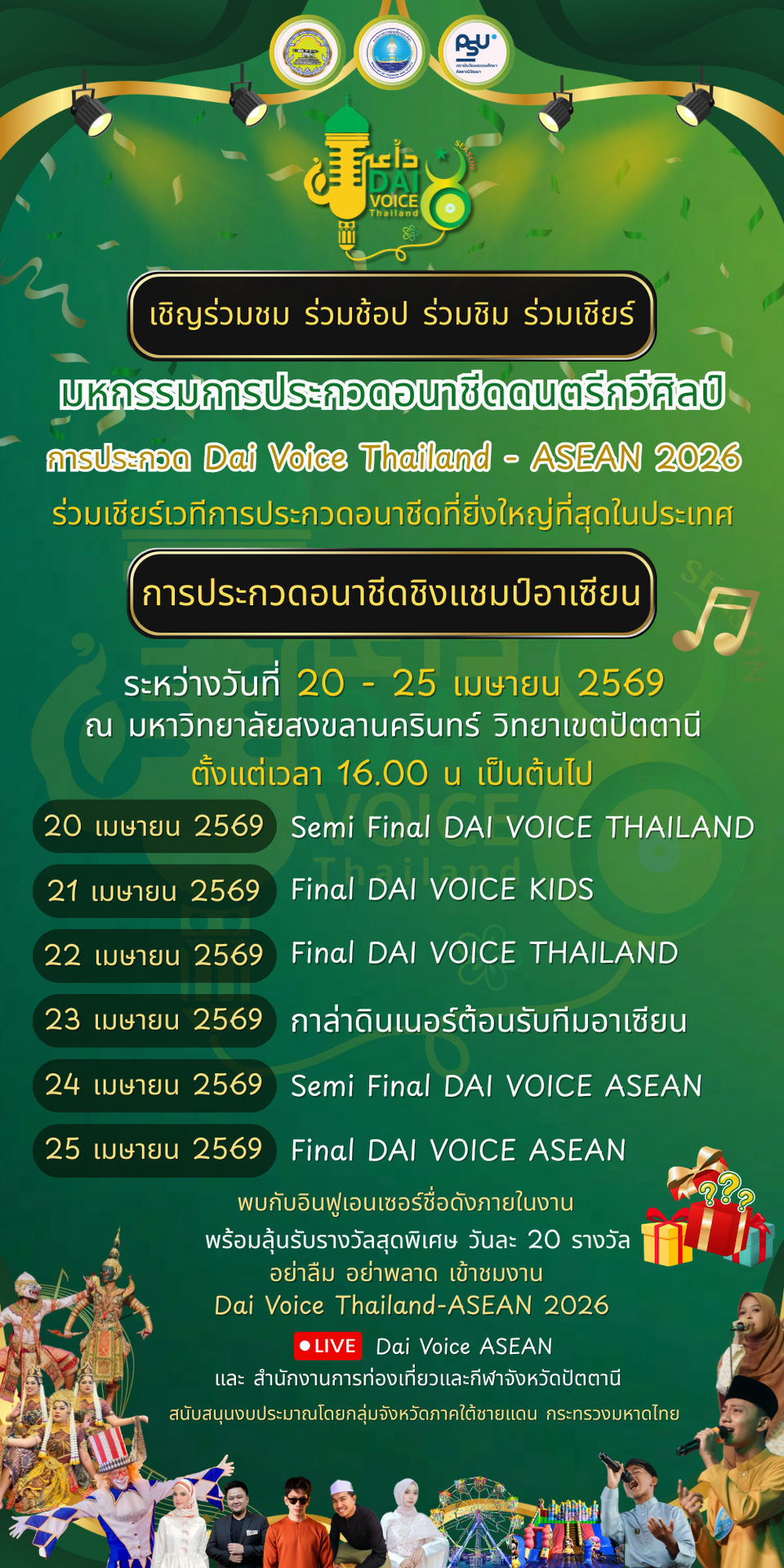 จังหวัดปัตตานี โดยสำนักงานการท่องเที่ยวและกีฬาจังหวัดปัตตานี ขอเชิญชวนประชาชนและนักท่องเที่ยวทุกท่าน ร่วมสัมผัสประสบการณ์แห่งเสียงศิลป์อันทรงคุณค่า ในงานมหกรรมระดับนานาชาติ การประกวดนาชีดดนตรีกวีศิลป์ พร้อมร่วมเชียร์เวทีการประกวดอนาชีดที่ยิ่งใหญ่ที่สุดในประเทศไทย “Dai Voice Thailand – ASEAN 2026” เวทีแห่งพลังเสียง…สู่การชิงแชมป์อาเซียนอย่างยิ่งใหญ่ กำหนดจัดขึ้นระหว่างวันที่ 20 – 25 เมษายน 2569 ณ มหาวิทยาลัยสงขลานครินทร์ วิทยาเขตปัตตานี ตั้งแต่เวลา 16.00 น. เป็นต้นไป
