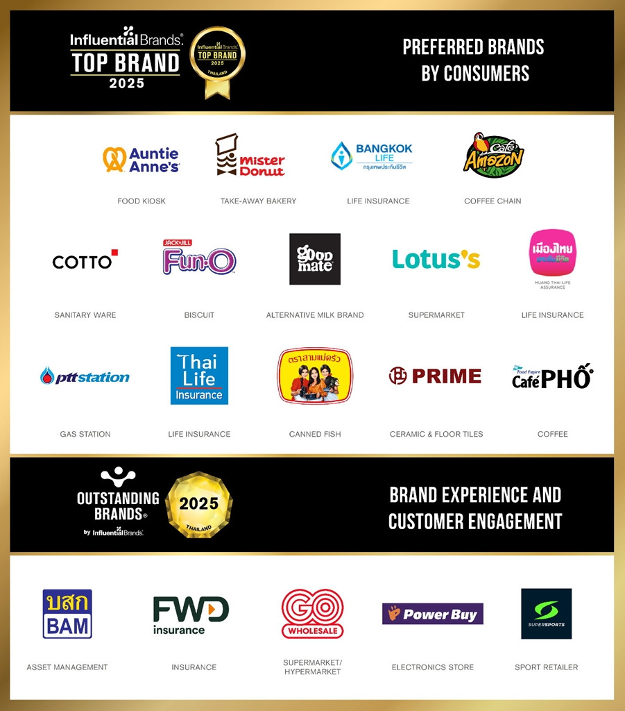 ภายในงานมีการมอบรางวัลให้แก่แบรนด์ชั้นนำจากหลากหลายอุตสาหกรรม ในสาขา Top Influential Brand หรือแบรนด์ที่ทรงอิทธิพลต่อผู้บริโภคมากที่สุด รวมกว่า 13 แบรนด์ ซึ่งล้วนได้รับการยอมรับในด้านความแข็งแกร่งของแบรนด์และผลการดำเนินธุรกิจที่โดดเด่นอย่างต่อเนื่อง พร้อมกันนี้ยังมีการประกาศ 5 รางวัล Outstanding Brands หรือแบรนด์ที่โดดเด่นประจำปี ตลอดจนการมอบรางวัล Top CEO ให้แก่ 4 ซีอีโอชั้นนำของประเทศไทยและเอเชีย ซึ่งเป็นผู้บริหารที่มีบทบาทสำคัญในการสร้างการเปลี่ยนแปลงและขับเคลื่อนองค์กรสู่การเติบโตอย่างยั่งยืน