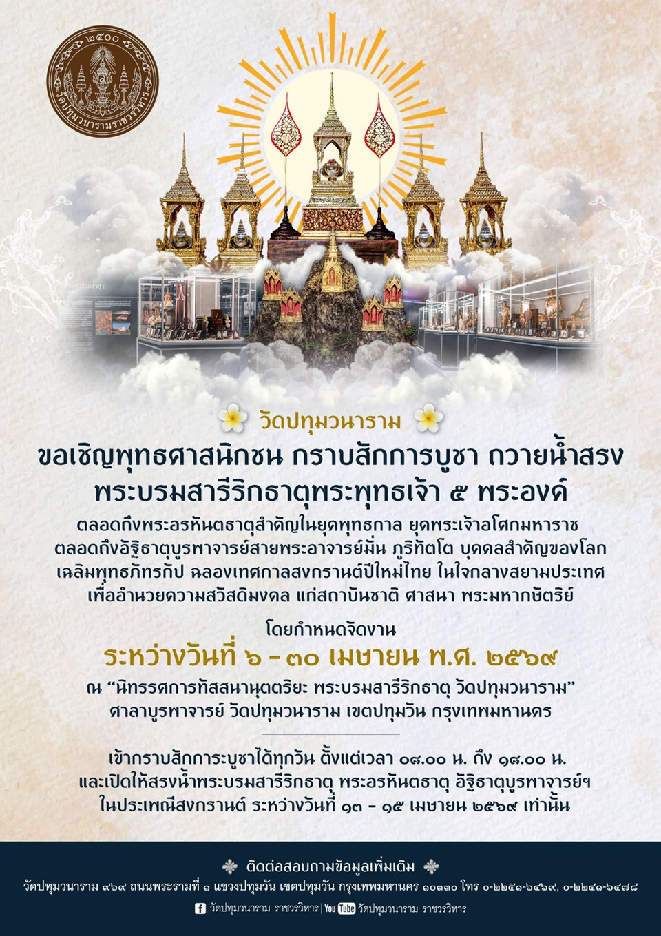 วัดปทุมวนาราม ราชวรวิหาร ใจกลางกรุงเทพมหานคร เปิดประสบการณ์ทางศาสนาครั้งสำคัญ เชิญพุทธศาสนิกชนและประชาชนร่วมกราบสักการะ “พระบรมสารีริกธาตุพระพุทธเจ้า 5 พระองค์” ที่ถูกรวมไว้ในพื้นที่เดียวกันอย่างสมบูรณ์ ภายในนิทรรศการ “ทัสสนานุตตริยะ” พร้อมเปิดโอกาสให้ร่วมสรงน้ำเพื่อความเป็นสิริมงคลในช่วงเทศกาลปีใหม่ไทย