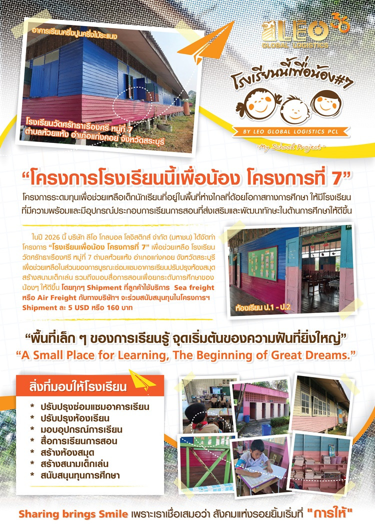 สำหรับ “โรงเรียนนี้เพื่อน้อง โครงการที่ 7” ในปีนี้ LEO เตรียมดำเนินการปรับปรุงและพัฒนา โรงเรียนวัดศรัทธาเรืองศรี หมู่ที่ 7 ตำบลห้วยแห้ง อำเภอแก่งคอย จังหวัดสระบุรี โดยครอบคลุมทั้งการซ่อมแซมอาคารเรียน ปรับปรุงห้องสมุด สร้างสนามเด็กเล่น และสนับสนุนสื่อการเรียนรู้ เพื่อสร้างสภาพแวดล้อมที่เอื้อต่อการเรียนรู้และส่งเสริมพัฒนาการของนักเรียนอย่างรอบด้าน นอกจากนี้ LEO ยังเปิดโอกาสให้พันธมิตรทางธุรกิจ ลูกค้า และผู้มีส่วนเกี่ยวข้องทุกภาคส่วน สามารถร่วมเป็นส่วนหนึ่งของโครงการได้อย่างง่ายดาย ผ่านการใช้บริการขนส่งของบริษัท โดยทุก shipment ที่ใช้บริการ Sea Freight หรือ Air Freight บริษัทจะร่วมสมทบทุนจำนวน 5 USD (หรือประมาณ 160 บาท) ต่อ shipment เพื่อสนับสนุนโครงการดังกล่าว ซึ่งนับเป็นการผสานการดำเนินธุรกิจเข้ากับการสร้างคุณค่าทางสังคมได้อย่างเป็นรูปธรรม