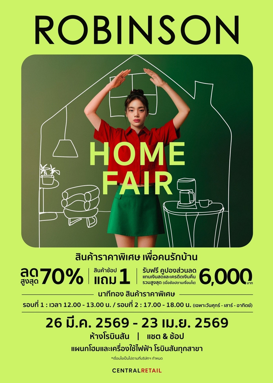 พร้อมเอาใจคนรักบ้านกับแคมเปญ “ROBINSON HOME FAIR” ชวนช้อปไอเทมแต่งบ้านและเครื่องใช้ภายในบ้านที่คัดสรรมาอย่างครบครัน ระหว่างวันที่ 26 มีนาคม – 23 เมษายน 2569 ที่แผนกบ้านและเครื่องใช้ไฟฟ้า ห้างสรรพสินค้า โรบินสันทุกสาขา กับข้อเสนอสุดคุ้มมากมาย ไม่ว่าจะเป็น...