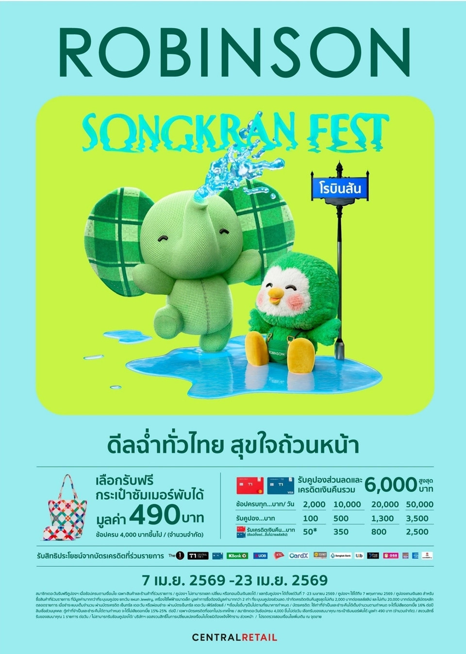 • Pop-up Fan & Buddha Bathing Point: รับฟรี! พัดนกโรบิ้นสุดคิ้วต์คลายร้อน ระหว่างวันที่ 11 – 12 เมษายน 2569 พร้อมเติมเต็มความเป็นสิริมงคลในช่วงปีใหม่ไทย กับกิจกรรม Buddha Bathing Point จุดสรงน้ำพระ ระหว่างวันที่ 4 – 15 เมษายน 2569 ชวนครอบครัวทั่วไทยร่วมสืบสานประเพณีไทยและเริ่มต้นปีใหม่อย่างเป็นมงคล ที่ห้างารรพสินค้าโรบินสันทุกสาขา (ยกเว้นสาขาจังซีลอน)