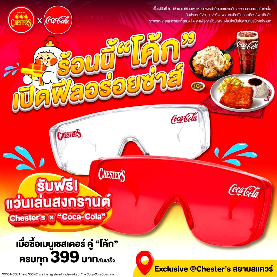วันที่ 11 เม.ย.69 บริษัท เชสเตอร์ ฟู้ด จำกัด จับมือ บริษัท ไทยน้ำทิพย์ คอร์ปอเรชั่น จำกัด (มหาชน) จัดแคมเปญรับซัมเมอร์ “Chester’s x Coca-Cola” มอบประสบการณ์ความอร่อยฟีลซ่า พร้อมแจก “แว่นเล่นสงกรานต์” รุ่นลิมิเต็ดเอดิชัน สำหรับลูกค้าที่ซื้อเมนูเชสเตอร์คู่โค้กครบ 399 บาทต่อใบเสร็จ รับฟรีทันที 1 ชิ้น โดยแว่นดีไซน์พิเศษกันน้ำ ใส่เล่นสงกรานต์ได้ตลอดวัน