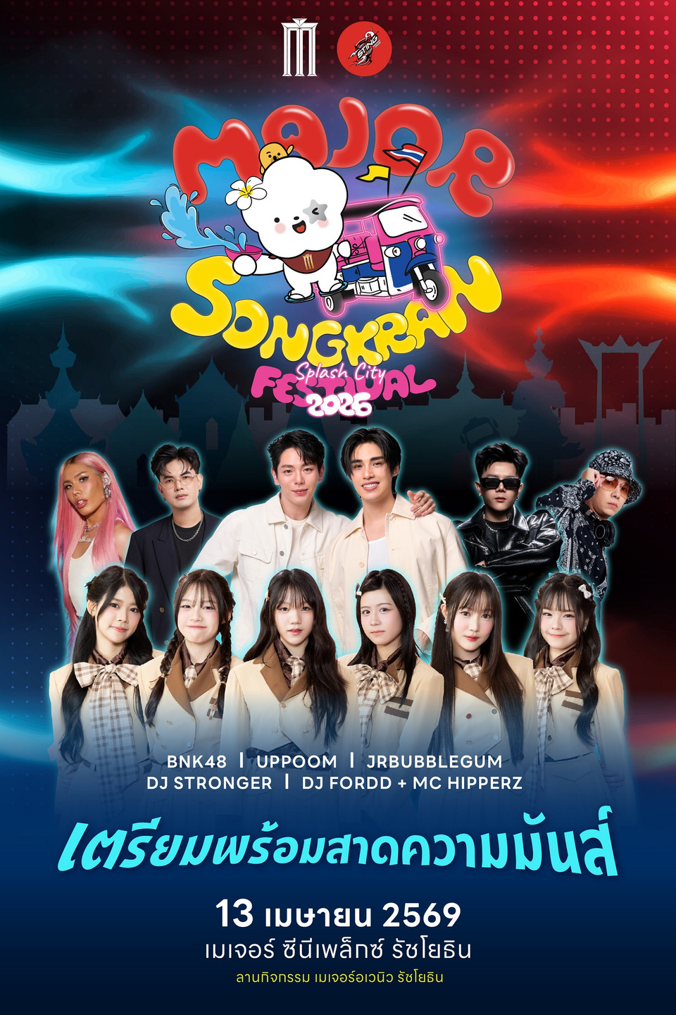 เมเจอร์ ซีนีเพล็กซ์ กรุ้ป ร่วมกับ สติงค์ เอเนอร์จี้ดริ๊งก์ โดย บริษัท ซันโทรี่ เป๊ปซี่โค เบเวอเรจ (ประเทศไทย) จำกัด เนรมิต เมเจอร์ อเวนิว รัชโยธิน ให้เป็นแลนด์มาร์กแห่งความสนุกในเทศกาลสงกรานต์ที่ตอบโจทย์ทุกเจเนอเรชั่นจัดงาน “Major Songkran Festival 2026” ต่อเนื่องเป็นปีที่ 3 ภายใต้คอนเซปต์ “Thai Soft Power” มุ่งเน้นการยกระดับวัฒนธรรมไทยผ่านความคิดสร้างสรรค์ร่วมสมัย พร้อมระเบิดความมันส์การเล่นน้ำดับร้อนแบบจัดเต็มในวันที่ 13 เมษายน 2569 ตั้งแต่เวลา 15.00 - 22.00 น. ณ ลานกิจกรรม เมเจอร์ อเวนิว รัชโยธิน ชมฟรีคอนเสิร์ตกับศิลปินวง BNK48, อัพ ภูมิพัฒน์, ภูมิ ภูริพันธ์ และ Jrbubblegum พร้อมตอบรับกระแสไวรัล “การห่มสไบใส่ยีนส์” ชวนทุกคนมาร่วมสร้าง Soft Power ห่มสไบมาเล่นน้ำร่วมสร้างสีสันและลุ้นรับของรางวัลพิเศษภายในงาน