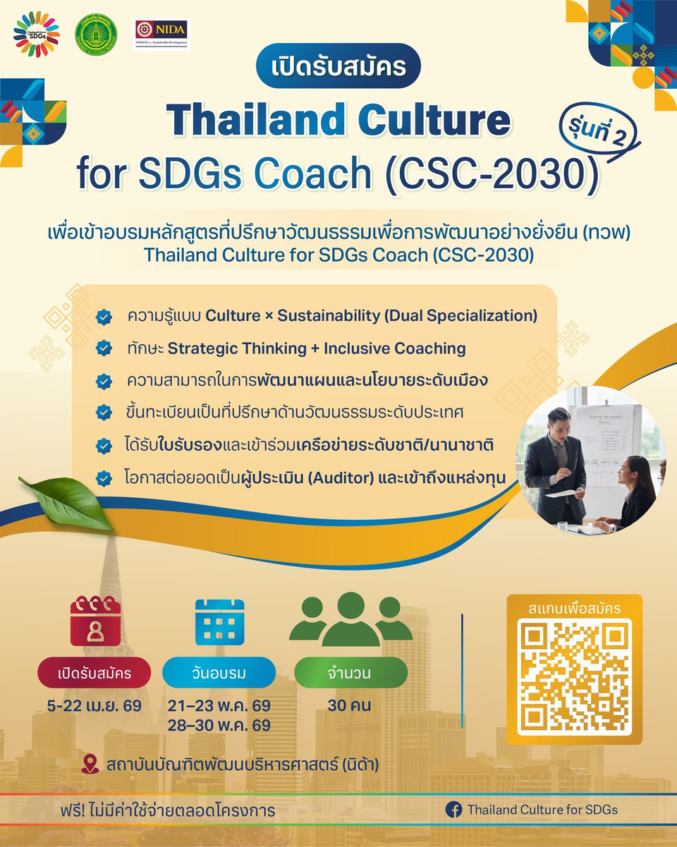 กรมส่งเสริมวัฒนธรรม กระทรวงวัฒนธรรม เดินหน้าขับเคลื่อนการพัฒนาเมืองไทยสู่ความยั่งยืน ผ่านการเปิดรับสมัครผู้เข้าร่วมหลักสูตร Thailand Culture for SDGs Coach (CSC-2030) รุ่นที่ 2 ซึ่งเป็นส่วนหนึ่งของการพัฒนากลไก “ที่ปรึกษาวัฒนธรรม” ระดับประเทศ เพื่อสนับสนุนการพัฒนาเมืองด้วยมิติวัฒนธรรมอย่างเป็นระบบ โดยโครงการมุ่งเน้นการเชื่อมโยง “ทุนทางวัฒนธรรม” เข้ากับการพัฒนาเศรษฐกิจ สังคม และคุณภาพชีวิตของคนในพื้นที่ พร้อมยกระดับศักยภาพบุคลากรให้สามารถทำหน้าที่เป็นตัวกลางในการเชื่อมโยงนโยบาย แผนงาน และเครือข่ายความร่วมมือ ทั้งในระดับพื้นที่และระดับประเทศ สอดคล้องกับเป้าหมายการพัฒนาที่ยั่งยืน (SDGs) และกรอบแนวคิด Culture 2030 ของ UNESCO