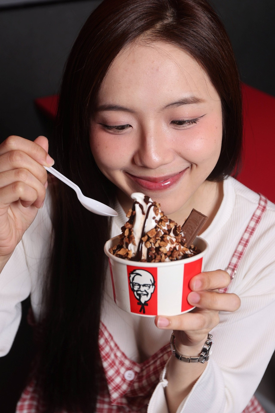 - โคนคิทแคทโอเวอร์โหลด ซอฟต์เสิร์ฟเนื้อเนียนแน่น หอมกลิ่นวานิลลา ดริปด้วยซอสคิทแคทเข้มข้น โรยครัมเบิลคิทแคทแบบจัดเต็ม ราคาเพียง 25 บาท ที่ร้าน KFC ทุกสาขาที่ร่วมรายการ