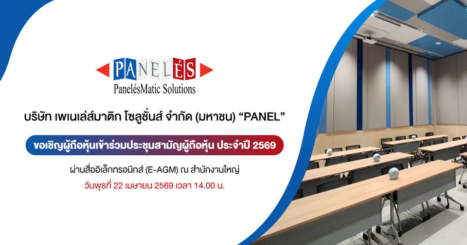 บมจ.เพเนเล่ส์มาติก โซลูชั่นส์ (PANEL) ผู้นำระบบประตูห้องผ่าตัด ประตูอัตโนมัติ ผนังบานเลื่อนกันเสียง และห้องเก็บเสียงเคลื่อนที่ เตรียมพร้อมสำหรับการจัดการประชุมสามัญผู้ถือหุ้นประจำปี 2569ในรูปแบบ E-AGM ผ่านระบบออนไลน์ในวันที่ 22 เม.ย.นี้ ฟาก CEO “จูเลีย ดับเบิ้ลยู เพ็ชญไพศิษฎ์” ฝากบอกว่า มาร่วมโหวตวาระจ่ายเงินปันผลงวดประจำปี 2568 เป็นเงินสดในอัตราหุ้นละ 0.033 บาท คิดเป็น 41.54% ของกำไรสุทธิ ซึ่งสูงกว่านโยบายการจ่ายเงินปันผลที่ระดับ 40% เตรียมรับทรัพย์กันเต็มๆในวันที่ 20 พ.ค. 2569 นี้ แถม ยังมีแจกวอร์แรนต์ฟรี 2 รุ่น ได้แก่ PANEL-W1 อายุ 1 ปี อัตราที่จัดสรร 4 หุ้นสามัญเดิมต่อ 1 หน่วยใบสำคัญแสดงสิทธิ มีราคาใช้สิทธิแปลงสภาพเป็นหุ้นอยู่ที่ 1.30 บาทต่อหุ้น และ PANEL-W2 อายุ 3 ปี อัตราที่จัดสรร 8 หุ้นสามัญเดิมต่อ 1 หน่วยใบสำคัญแสดงสิทธิ ราคาใช้สิทธิแปลงสภาพที่ 3.68 บาทต่อหุ้น .. งานนี้ ผู้ถือหุ้นได้ชื่นใจกันทุกๆคนเลยคร้าา!!!