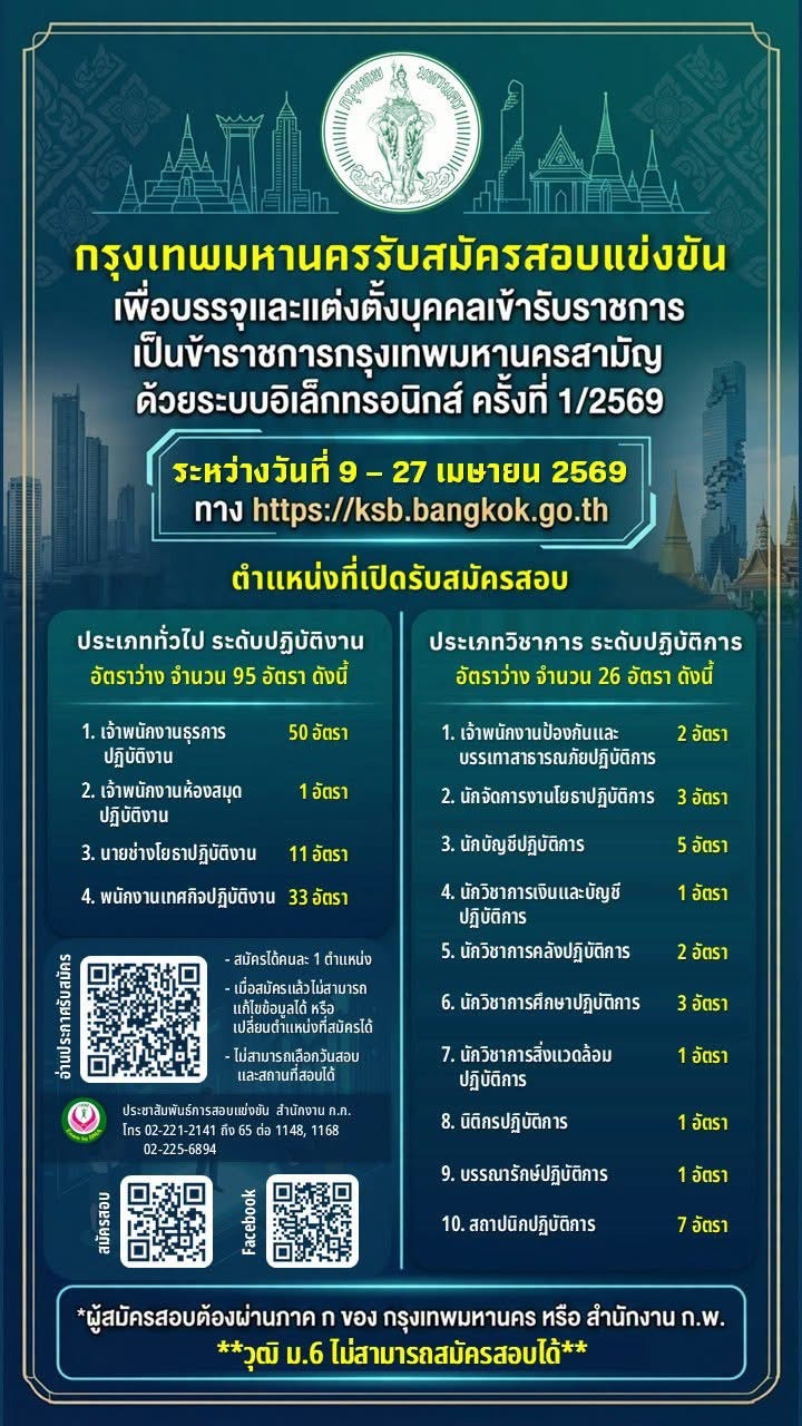 กรุงเทพมหานครประกาศเปิดรับสมัครสอบแข่งขันเพื่อบรรจุและแต่งตั้งบุคคลเข้ารับราชการเป็นข้าราชการกรุงเทพมหานครสามัญด้วยระบบอิเล็กทรอนิกส์ ครั้งที่ 1/2569 โดยเปิดให้ผู้ที่สนใจสมัครได้ตั้งแต่วันที่ 9 ถึง 27 เมษายน 2569 ผ่านทางเว็บไซต์ https://ksb.bangkok.go.th ซึ่งการเปิดรับสมัครในรอบนี้ครอบคลุมตำแหน่งต่าง ๆ รวมทั้งสิ้น 121 อัตรา ดังนี้
