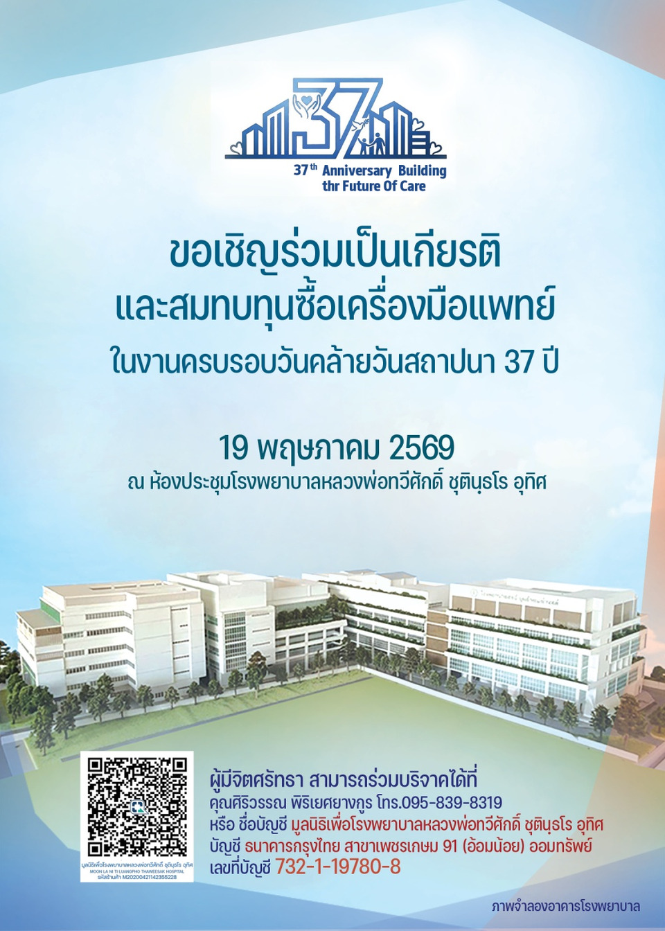 โรงพยาบาลหลวงพ่อทวีศักดิ์ ชุตินฺธโร อุทิศ ขอเชิญผู้มีจิตศรัทธาร่วมเป็นเกียรติและร่วมสมทบทุนจัดซื้อเครื่องมือแพทย์ในงานครบรอบวันคล้ายวันสถาปนา 37 ปี และโครงการอาคารครบรอบ 37 ปี "The Future of Care" ซึ่งมีกำหนดจัดงานขึ้นในวันที่ 19 พฤษภาคม 2569 ณ ห้องประชุมโรงพยาบาลหลวงพ่อทวีศักดิ์ ชุตินฺธโร อุทิศ สำหรับผู้ที่ประสงค์จะร่วมบริจาคสามารถติดต่อได้ที่คุณศิริวรรณ พิริยศยางกูร โทรศัพท์ 095-839-8319 หรือบริจาคผ่านบัญชีธนาคารกรุงไทย สาขาเพชรเกษม 91 (อ้อมน้อย) ประเภทออมทรัพย์ ชื่อบัญชี "มูลนิธิเพื่อโรงพยาบาลหลวงพ่อทวีศักดิ์ ชุตินฺธโร อุทิศ" เลขที่บัญชี 732-1-19780-8 โดยพลังศรัทธาของทุกท่านจะช่วยเสริมสร้างศักยภาพทางการแพทย์และเพิ่มโอกาสในการรักษาแก่ผู้ป่วยในอนาคตสืบไป