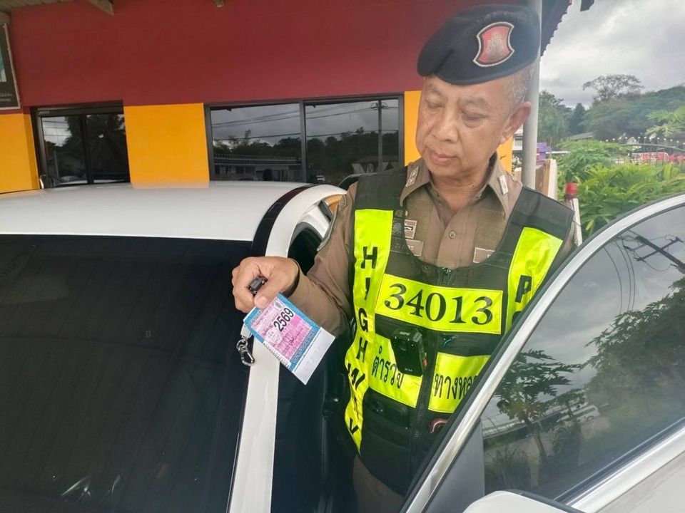 โดยเจ้าตัวนำสำเนาคู่มือรถและแผ่นป้ายภาษีมาให้ตรวจสอบเมื่อพิจารณาป้ายภาษี พบว่า ระบุทะเบียนกรุงเทพมหานคร หมดอายุวันที่ 8 มีนาคม 2569 แต่ ลักษณะกระดาษ การพิมพ์ไม่เป็นไปตามรูปแบบที่กรมการขนส่งทางบกกำหนด ทำให้เจ้าหน้าที่เชื่อว่าเป็น เอกสารราชการปลอม จึงควบคุมตัวไว้ตรวจสอบเพิ่มเติม