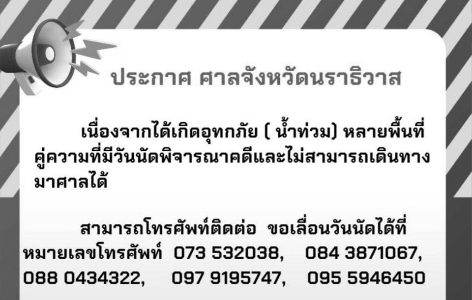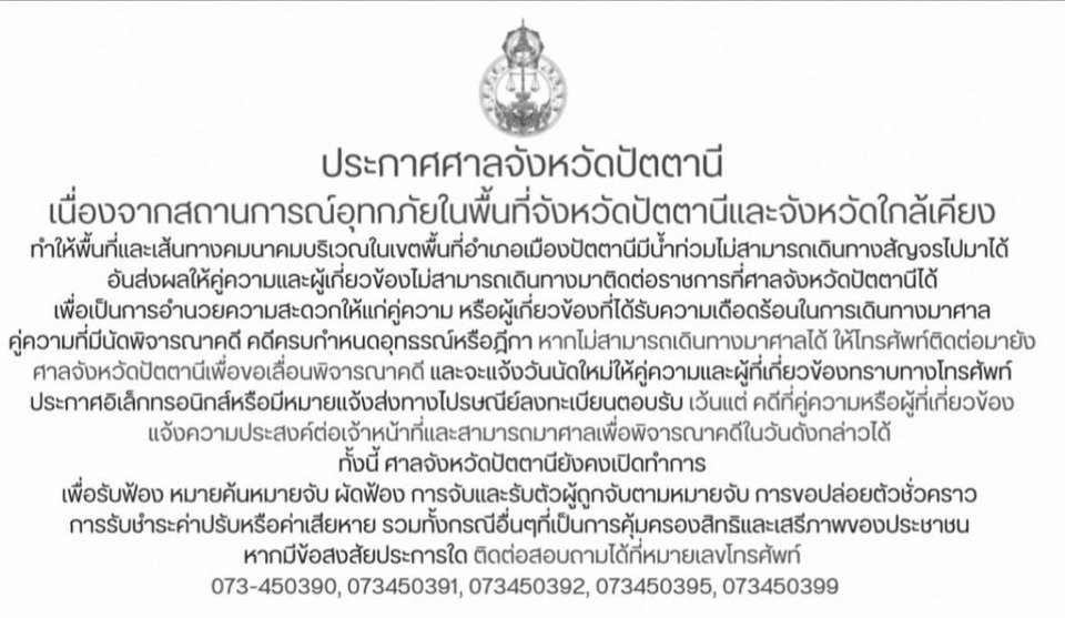 "ศาลในพื้นที่ภาคใต้ประชาสัมพันธ์ให้คู่ความที่ได้รับความเดือดร้อนในการเดินทางไปยังศาล เนื่องจากเหตุน้ำท่วม ขอให้โทรติดต่อที่ศาลเพื่อประสานงานขอเลื่อนการนัดพิจารณาคดี หรือกรณีอื่นๆ"
