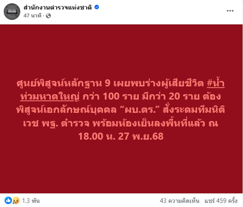วันที่ 27 พฤศจิกายน 2568 เพจเฟซบุ๊ก "สำนักงานตำรวจแห่งชาติ" ได้โพสต์รายงานว่า “ศูนย์พิสูจน์หลักฐาน 9 เผยพบร่างผู้เสียชีวิต #น้ำท่วมหาดใหญ่ กว่า 100 ราย มีกว่า 20 ราย ต้องพิสูจน์เอกลักษณ์บุคคล “ผบ.ตร.” สั่งระดมทีมนิติเวช พฐ. ตำรวจ พร้อมห้องเย็นลงพื้นที่แล้ว ณ 18.00 น. 27 พ.ย.68”