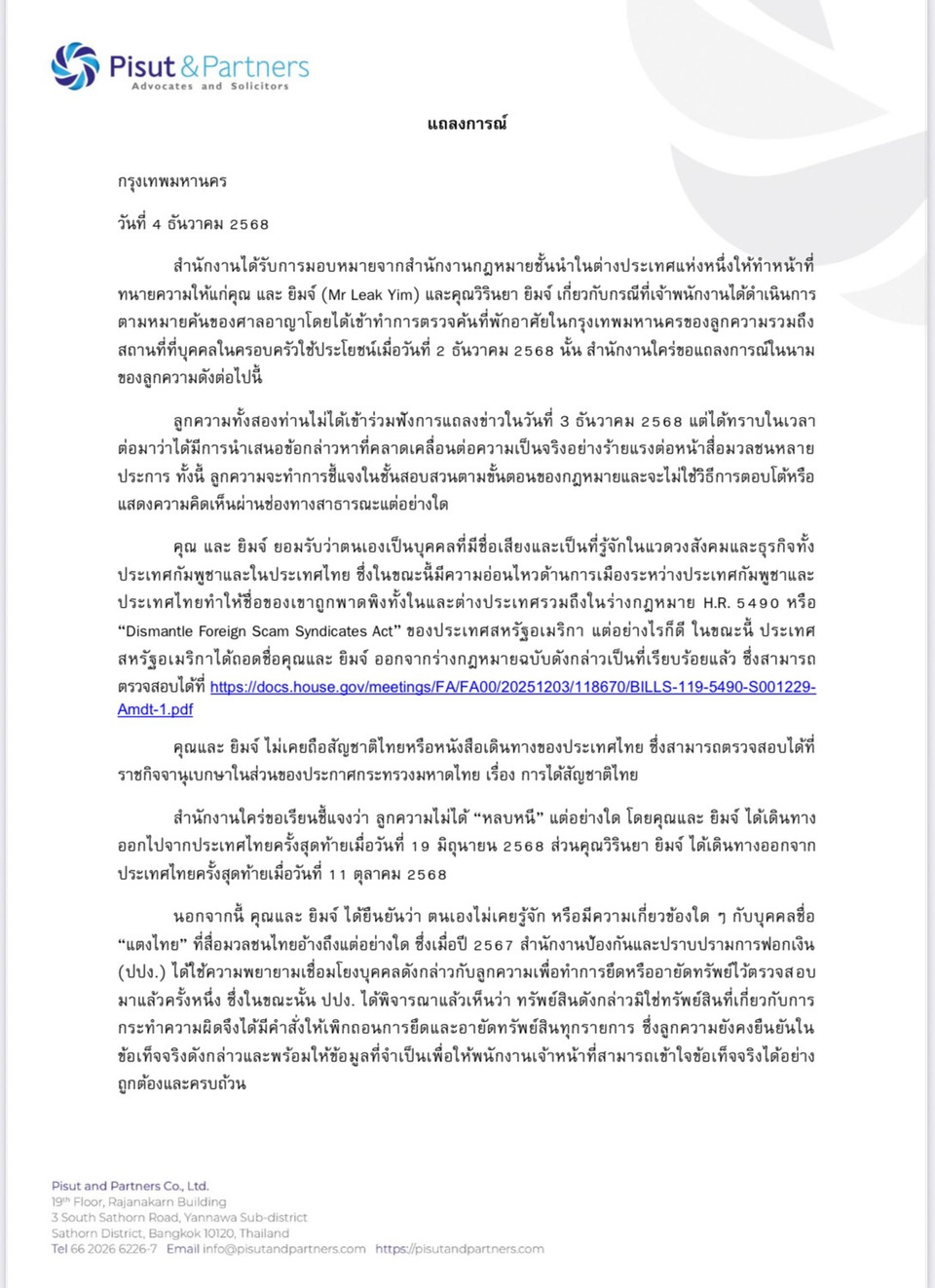 เมื่อวันที่ 4 ธันวาคม 2568 นายและ ยิมจ์-ภรรยา”ได้มอบหมายให้ทีมทนายความจากบริษัท พิสุทธิ์ แอนด์ พาร์ทเนอร์ส จำกัด ออกแถลงการณ์ ชี้แจงกรณีถูกเจ้าหน้าที่นำหมายค้นของศาลอาญาเข้าตรวจค้นที่พักอาศัยของนายและ ยิมจ์ (Mr Leak Yim) และนางวิรินยา ยิมจ์ ในพื้นที่กรุงเทพฯ รวมถึงสถานที่ที่ครอบครัวใช้ประโยชน์เมื่อวันที่ 2 ธันวาคมที่ผ่านมา ระบุความว่าการแถลงข่าวผลปฏิบัติการ “ถอนรากสแกมเมอร์ข้ามชาติ” ต่อสื่อมวลชน เมื่อวันที่ 3 ธันวาคมที่ผ่านมา มีคลาดเคลื่อนต่อความเป็นจริงอย่างร้ายแรง ทั้งนี้ ลูกความจะทำการชี้แจงในชั้นสอบสวนตามขั้นตอนของกฎหมาย และจะไม่ใช้วิธีการตอบโต้หรือแสดงความคิดเห็นผ่านช่องทางสาธารณะแต่อย่างใด โดยนาย และ ยิมจ์ ยอมรับว่าตนเองเป็นบุคคลที่มีชื่อเสียงและเป็นที่รู้จักในแวดวงสังคมและธุรกิจ ทั้งประเทศกัมพูชาและในประเทศไทย ซึ่งในขณะนี้มีความอ่อนไหวด้านการเมืองระหว่างประเทศกัมพูชาและประเทศไทย ทำให้ชื่อของเขาถูกพาดพิงทั้งในและต่างประเทศ รวมถึงในร่างกฎหมาย H.R. 5490 หรือ “Dismantle Foreign Scam Syndicates Act” ของประเทศสหรัฐอเมริกา แต่อย่างไรก็ดี ในขณะนี้ประเทศสหรัฐอเมริกาได้ถอดชื่อนายและ ยิมจ์ ออกจากร่างกฎหมายฉบับดังกล่าวเป็นที่เรียบร้อยแล้ว ซึ่งสามารถตรวจสอบได้ที่ https://docs.house.gov/meetings/FA/FA00/20251203/118670/BILLS-119-5490-S001229-Amdt-1.pdf