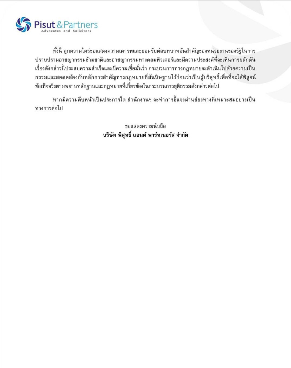 ทั้งนี้ ลูกความใคร่ขอแสดงความเคารพและยอมรับต่อบทบาทอันสำคัญของหน่วยงานของรัฐในการปราบปรามอาชญากรรมข้ามชาติและอาชญากรรมทางคอมพิวเตอร์และมีความประสงค์ที่จะเห็นการผลักดันเรื่องดังกล่าวนี้ให้ประสบความสำเร็จและมีความเชื่อมั่นว่า กระบวนการทางกฎหมายจะดำเนินไปด้วยความเป็นธรรมและสอดคล้องกับหลักการสำคัญทางกฎหมายที่สันนิษฐานไว้ก่อนว่าเป็นผู้บริสุทธิ์ เพื่อที่จะได้พิสูจน์ข้อเท็จจริงตามพยานหลักฐานและกฎหมายที่เกี่ยวข้องในกระบวนการยุติธรรมดังกล่าวต่อไป หากมีความคืบหน้าเป็นประการใด สำนักงานฯ จะทำการชี้แจงผ่านช่องทางที่เหมาะสมอย่างเป็นทางการต่อไป