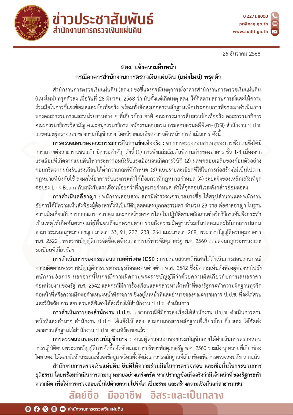 วันที่ 26 ธ.ค.68 สำนักงานการตรวจเงินแผ่นดิน เผยแพร่ข่าวประชาสัมพันธ์ แจ้งความคืบหน้า กรณีอาคารสำนักงานการตรวจเงินแผ่นดิน (แห่งใหม่) ทรุดตัว
