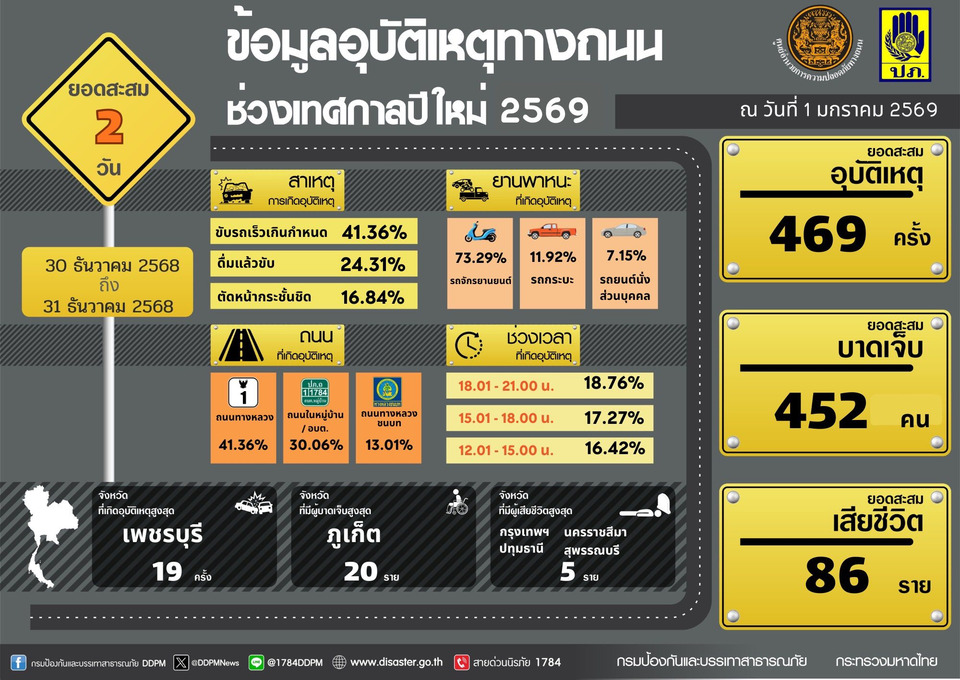 นายธีรพัฒน์ คัชมาตย์ อธิบดีกรมป้องกันและบรรเทาสาธารณภัย (ปภ.) ในฐานะเลขานุการคณะกรรมการศูนย์อำนวยการความปลอดภัยทางถนน และประธานแถลงข่าวสรุปผลการดำเนินงานของศูนย์อำนวยการป้องกันและลดอุบัติเหตุทางช่วงเทศกาลปีใหม่ พ.ศ. 2569 เปิดเผยว่า ศูนย์อำนวยการป้องกันและลดอุบัติเหตุทางถนนช่วงเทศกาลปีใหม่ พ.ศ. 2569 โดยกรมป้องกันและบรรเทาสาธารณภัยและความร่วมมือของภาคีเครือข่ายได้รวบรวมสถิติอุบัติเหตุทางถนน ประจำวันที่ 31 ธันวาคม 2568 ซึ่งเป็นวันที่สองของ การรณรงค์ “ขับขี่ปลอดภัย ลดความเร็ว ลดอุบัติเหตุ” เกิดอุบัติเหตุ 271 ครั้ง ผู้บาดเจ็บ 262 คน ผู้เสียชีวิต 53 ราย สาเหตุที่ทำให้เกิดอุบัติเหตุสูงสุด ได้แก่ ขับรถเร็ว ร้อยละ 40.96 ดื่มแล้วขับ ร้อยละ 27.31 ยานพาหนะที่เกิดอุบัติเหตุสูงสุด ได้แก่ รถจักรยานยนต์ ร้อยละ 74.44 ส่วนใหญ่เกิดบนเส้นทางตรง ร้อยละ 82.29 ถนนกรมทางหลวง ร้อยละ 39.48 ถนนใน อบต./หมู่บ้าน ร้อยละ 32.47 ช่วงเวลาที่เกิดอุบัติเหตุสูงสุด ได้แก่ ช่วงเวลา 18.01 – 21.00 น. ร้อยละ 18.82 ผู้บาดเจ็บและเสียชีวิตสูงสุด อยู่ในช่วงอายุ 40 - 49 ปี ร้อยละ 17.46 โดยจังหวัดที่เกิดอุบัติเหตุสูงสุด ได้แก่ เพชรบุรี (12 ครั้ง) จังหวัดที่มีผู้บาดเจ็บสูงสุด ได้แก่ พะเยา และสุราษฎร์ธานี (จังหวัดละ 12 คน) จังหวัดที่มีผู้เสียชีวิตสูงสุด ได้แก่ นครราชสีมา และสุพรรณบุรี (จังหวัดละ 4 ราย)