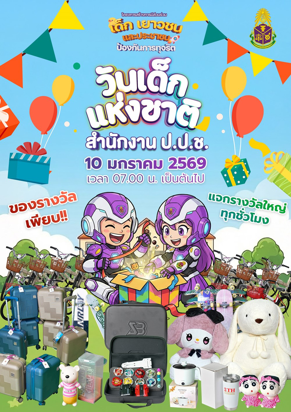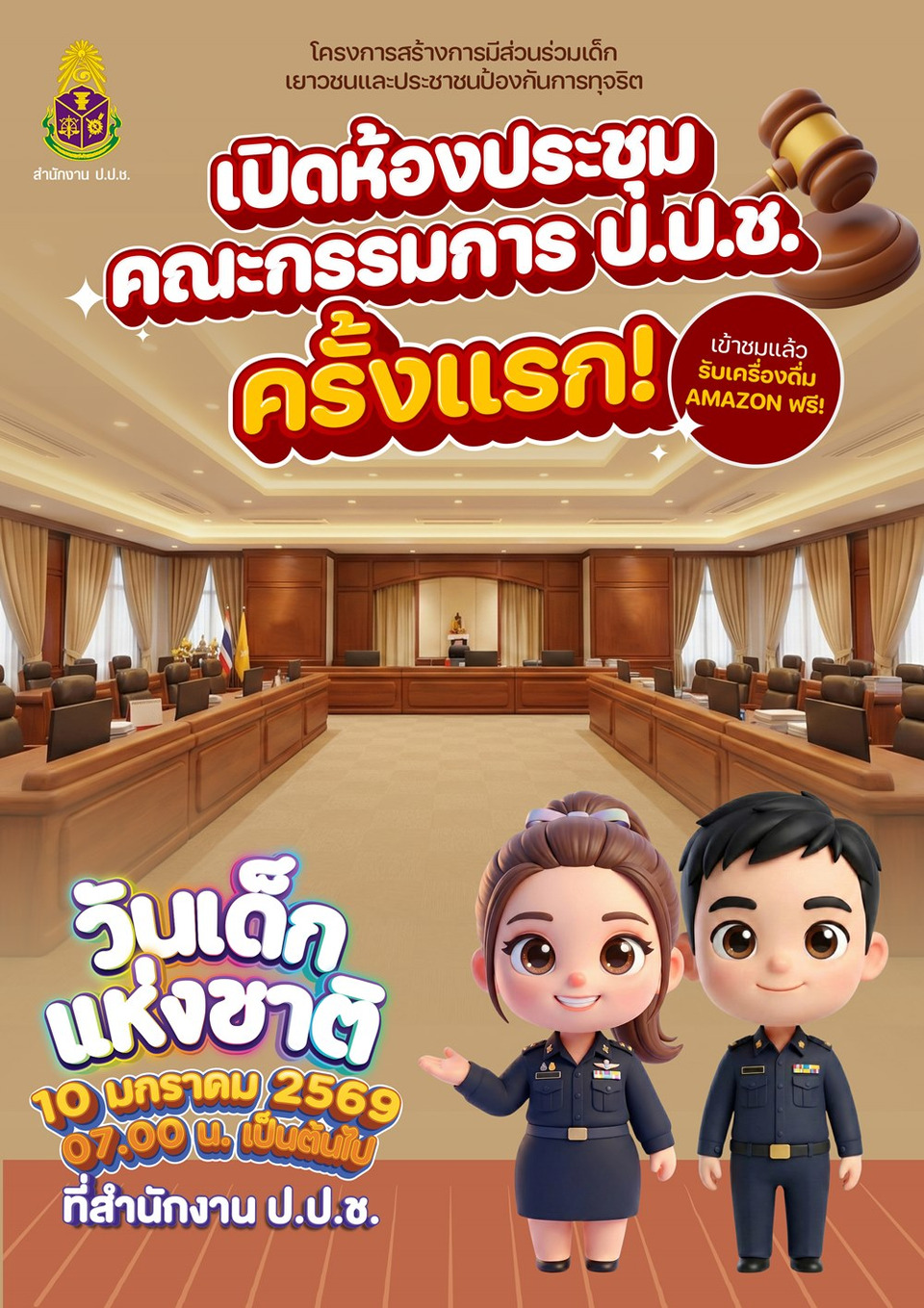 สำนักงานคณะกรรมการป้องกันและปราบปรามการทุจริตแห่งชาติ (สำนักงาน ป.ป.ช.) ขอเชิญเด็ก เยาวชน และประชาชนทั่วไป เข้าร่วมงานวันเด็กแห่งชาติ ซึ่งสำนักงาน ป.ป.ช. จัดขึ้นเป็นครั้งแรก เปิดโอกาสให้เยาวชนได้เยี่ยมชมสถานที่สำคัญภายในสำนักงาน รวมถึงห้องประชุมคณะกรรมการ ป.ป.ช. พร้อมร่วมกิจกรรมสร้างสรรค์และรับของรางวัลมากมาย