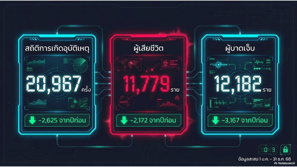 สถิติข้อมูลการเกิดอุบัติเหตุทางถนนปี 2568 จากระบบ PRS พบว่าอุบัติเหตุทางถนนเกิดขึ้น 20,967 ครั้ง ลดลงจากปีก่อนกว่า 11% ผู้เสียชีวิต 11,779 ราย ลดลงกว่า 15% และผู้บาดเจ็บ 12,182 ราย ลดลงกว่า 20% สะท้อนผลจากการทำงานเชิงรุกของตำรวจจราจรทั่วประเทศ อย่างไรก็ตาม สาเหตุหลักของการเกิดอุบัติเหตุยังคงเป็นการขับรถเร็วเกินกฎหมายกำหนด รองลงมาคือการตัดหน้ากระชั้นชิด ง่วงหลับใน ขับจี้ท้าย และเมาสุรา ขณะที่ยานพาหนะที่เกิดอุบัติเหตุสูงสุดยังคงเป็นรถจักรยานยนต์