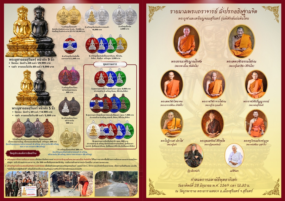 พิธีมหาพุทธาภิเษกเพื่อความเป็นสิริมงคลจะจัดขึ้นในวันที่ 28 มิถุนายน 2569 เวลา 13.30 น. ณ วัดบูรพาราม พระอารามหลวง อำเภอเมืองสุรินทร์ จังหวัดสุรินทร์