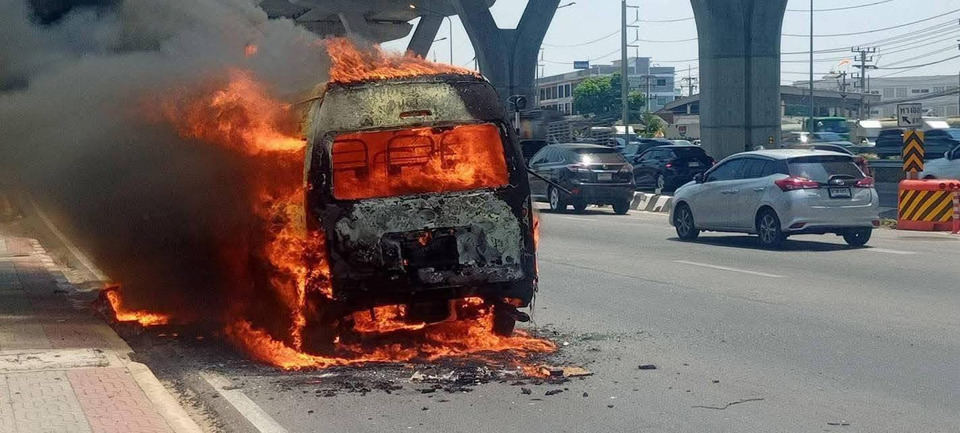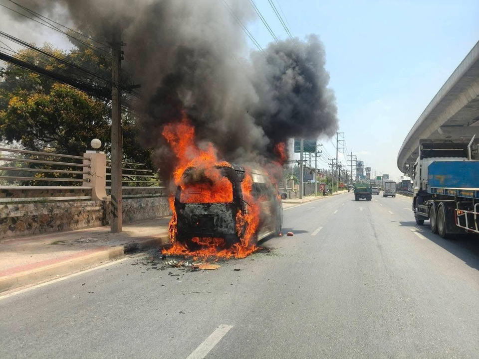 ระทึก! ไฟไหม้รถตู้กลางถนนพระราม 2 สมุทรสาคร เจ้าหน้าที่เร่งดับเพลิง