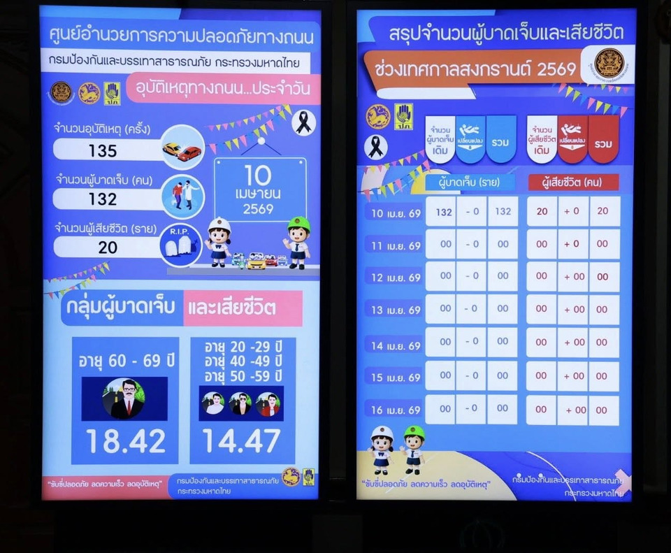 เมื่อวันที่ 11 เม.ย.2569 ที่กรมป้องกันและบรรเทาสาธารณภัย (ปภ.) พล.ต.อ.สำราญ นวลมา รองผู้บัญชาการตำรวจแห่งชาติ (รองผบ.ตร.) ในฐานะประธานแถลงข่าวสรุปผลการดำเนินงานของศูนย์อำนวยการป้องกันและลดอุบัติเหตุทางช่วงเทศกาลสงกรานต์ พ.ศ. 2569 เปิดเผยว่า ศูนย์อำนวยการป้องกันและลดอุบัติเหตุทางถนนช่วงเทศกาลสงกรานต์ พ.ศ. 2569 โดยกรมป้องกันและบรรเทาสาธารณภัยและความร่วมมือของภาคีเครือข่ายได้รวบรวมสถิติอุบัติเหตุทางถนน ประจำวันที่ 10เม.ย.69 ซึ่งเป็นวันแรกของการรณรงค์ "ขับขี่ปลอดภัย ลดความเร็ว ลดอุบัติเหตุ" เกิดอุบัติเหตุ 135 ครั้ง ผู้บาดเจ็บ 132 คน ผู้เสียชีวิต 20 ราย สาเหตุที่ทำให้เกิดอุบัติเหตุสูงสุด ได้แก่ ขับรถเร็ว ร้อยละ 37.78 ตัดหน้ากระชั้นชิด ร้อยละ 22.96 ยานพาหนะที่เกิดอุบัติเหตุสูงสุด ได้แก่ รถจักรยานยนต์ ร้อยละ 70.49 ส่วนใหญ่เกิดบนเส้นทางตรง ร้อยละ 78.52 ถนนกรมทางหลวง ร้อยละ 48.15 ถนนใน อบต./หมู่บ้าน ร้อยละ 20.74 ช่วงเวลาที่เกิดอุบัติเหตุสูงสุด ได้แก่ ช่วงเวลา 15.01 - 18.00 น. ร้อยละ 21.48 ผู้บาดเจ็บและเสียชีวิตสูงสุดอยู่ในช่วงอายุ 60 - 69 ปี ร้อยละ 18.42