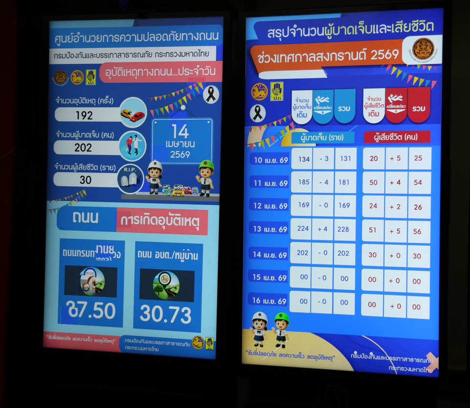 วันที่ 5 เม.ย. 69 เวลา 09.50 น. ที่กรมป้องกันและบรรเทาสาธารณภัย (ปภ.) ศูนย์อำนวยการความปลอดภัยทางถนน (ศปถ.) แถลงสรุปสถิติอุบัติเหตุทางถนนช่วงเทศกาลสงกรานต์ 2569 ประจำวันที่ 14 เมษายน 2569 เกิดอุบัติเหตุ 192 ครั้ง ผู้บาดเจ็บ 202 คน ผู้เสียชีวิต 30 ราย สรุปอุบัติเหตุทางถนนสะสมในช่วง 5 วัน ของการรณรงค์ (10 – 14 เม.ย. 69) เกิดอุบัติเหตุรวม 951 ครั้ง ผู้บาดเจ็บ รวม 911 คน ผู้เสียชีวิต รวม 191 ราย