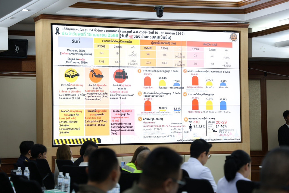 นายเจเศรษฐ์ ไทยเศรษฐ์ รัฐมนตรีช่วยว่าการกระทรวงมหาดไทย ในฐานะประธานแถลงข่าวสรุปผลการดำเนินงานของศูนย์อำนวยการป้องกันและลดอุบัติเหตุทางช่วงเทศกาลสงกรานต์ พ.ศ. 2569 เปิดเผยว่า ศปถ. ได้รวบรวมสถิติอุบัติเหตุทางถนน ประจำวันที่ 15 เม.ย. 2569 ซึ่งเป็นวันที่หกของการรณรงค์ “ขับขี่ปลอดภัย ลดความเร็ว ลดอุบัติเหตุ” เกิดอุบัติเหตุ 156 ครั้ง ผู้บาดเจ็บ 161 คน ผู้เสียชีวิต 23 ราย สาเหตุที่ทำให้เกิดอุบัติเหตุสูงสุด ได้แก่ ขับรถเร็ว ร้อยละ 43.59 ดื่มแล้วขับ ร้อยละ 25.64 ยานพาหนะที่เกิดอุบัติเหตุสูงสุด ได้แก่ รถจักรยานยนต์ ร้อยละ 67.84 ส่วนใหญ่เกิดบนเส้นทางตรง ร้อยละ 89.74 บนถนนกรมทางหลวง ร้อยละ 46.79 ช่วงเวลาที่เกิดอุบัติเหตุสูงสุด ได้แก่ ช่วงเวลา 18.01 – 21.00 น. ร้อยละ 17.95 ผู้บาดเจ็บและเสียชีวิตสูงสุด อยู่ในช่วงอายุ 20 - 29 ปี ร้อยละ 24.46 โดยจังหวัดที่เกิดอุบัติเหตุสูงสุด ได้แก่ เชียงราย (10 ครั้ง) จังหวัดที่มีผู้บาดเจ็บสูงสุด ได้แก่ เชียงราย (11 คน) จังหวัดที่มีผู้เสียชีวิตสูงสุด ได้แก่ เชียงราย (3 ราย)