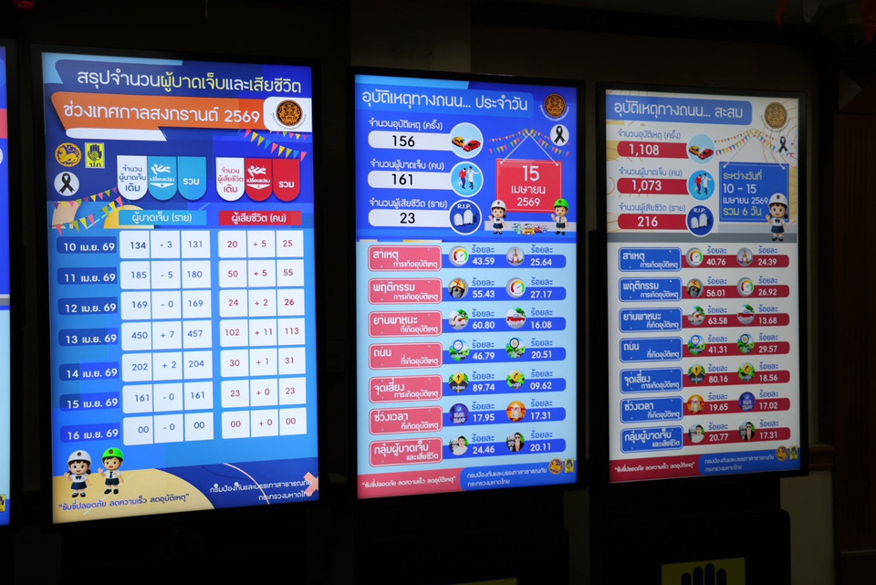 สรุปอุบัติเหตุทางถนนสะสมในช่วง 6 วันของการรณรงค์ (10 – 15 เม.ย. 69) เกิดอุบัติเหตุรวม 1,108 ครั้ง ผู้บาดเจ็บ รวม 1,073 คน ผู้เสียชีวิต รวม 216 ราย จังหวัดที่เกิดอุบัติเหตุสะสมสูงสุดได้แก่ แพร่ (47 ครั้ง) จังหวัดที่มีผู้บาดเจ็บสะสมสูงสุด ได้แก่ แพร่ (49 คน) จังหวัดที่มีผู้เสียชีวิตสะสมสูงสุด ได้แก่ กรุงเทพมหานคร (19 ราย)