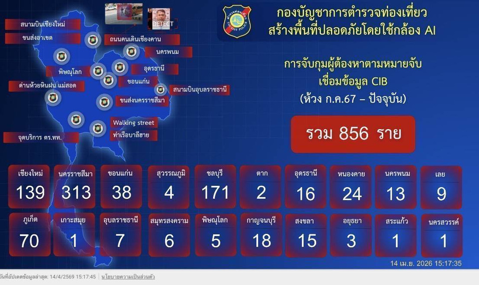 ทั้งนี้ จากการระดมกวาดล้างผู้ต้องหาตามหมายจับด้วยระบบกล้อง AI ระหว่างวันที่ 25 มีนาคม – 15 เมษายน 2569 สามารถจับกุมได้จำนวน 63 ราย ส่งผลให้มียอดสะสมรวมทั้งสิ้น 856 ราย สะท้อนถึงการบังคับใช้กฎหมายอย่างจริงจัง ควบคู่กับการยกระดับความปลอดภัยในแหล่งท่องเที่ยว เพื่อให้ประเทศไทยเป็นจุดหมายปลายทางที่ปลอดภัยสำหรับนักท่องเที่ยวจากทั่วโลกอย่างยั่งยืน