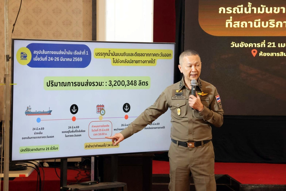 วันที่ 21 เม.ย.69 พล.ต.อ.ธัชชัย ปิตะนีละบุตร รองผู้บัญชาการตำรวจแห่งชาติ ในฐานะผู้อำนวยการศูนย์ปราบปรามการกระทำความผิดเกี่ยวกับน้ำมันเชื้อเพลิง สำนักงานตำรวจแห่งชาติ แถลงผลการปฏิบัติ กรณีเมื่อเวลา 04.00 น. ของวันเดียวกัน ได้มอบหมายให้เจ้าหน้าที่ตำรวจน้ำเข้าตรวจสอบเรือบรรทุกน้ำมันต้องสงสัย จำนวน 2 ลำ บริเวณกลางทะเลอ่าวไทย
