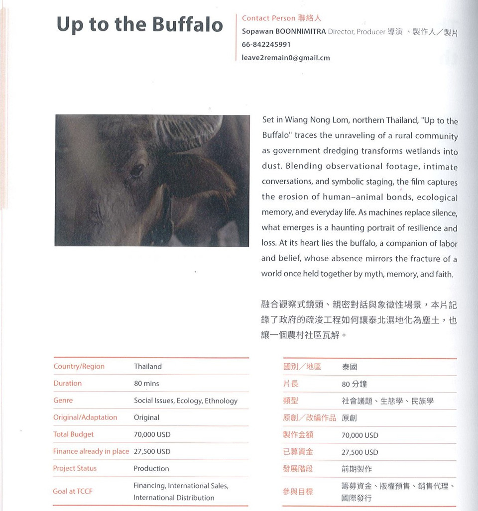 มหาวิทยาลัยกรุงเทพ ขอแสดงความยินดีกับดร.พีรชัย เกิดสินธุ์ ผู้ช่วยอธิการบดีสายวิชาการ และรักษาการคณบดีคณะดิจิทัลมีเดียและศิลปะภาพยนตร์ มหาวิทยาลัยกรุงเทพ เจ้าของผลงานโครงการภาพยนตร์สารคดีขนาดยาวเรื่อง Up to the Buffalo ได้รับคัดเลือกให้เป็นตัวแทนจากประเทศไทย ให้เข้าร่วมนำเสนอในเวที Pitching ของเทศกาล Taiwan Creative Content Festival 2025 (TCCF) พร้อมได้รับ 2 รางวัล Sustainable Future Award และ Docs by the Sea Award นับเป็นสองรางวัลที่ให้กำลังใจในผลงานการเล่าเรื่องของผืนน้ำเวียงหนองหล่ม ที่ผู้คนและควายยังคงหายใจร่วมกัน