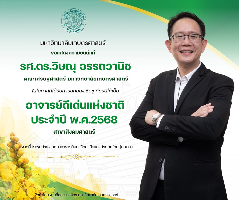 รศ.ดร.วิษณุ อรรถวานิช คณะเศรษฐศาสตร์ มก. ได้รับยกย่องเป็นอาจารย์ดีเด่นแห่งชาติ สาขาสังคมศาสตร์ ประจำปี 2568 บนเวทีวิชาการ ปอมท.