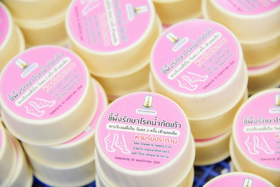 ผู้ช่วยศาสตราจารย์ ดร.ภญ.รุจิลักขณ์ รัตตะรมย์ เปิดเผยถึงการผลิตในครั้งนี้ว่า "เราได้รับทราบถึงความเดือดร้อนของพี่น้องทางภาคใต้ โดยเฉพาะปัญหาโรคน้ำกัดเท้าที่มาพร้อมกับน้ำท่วม มหาวิทยาลัยมหาสารคาม โดยคณะเภสัชศาสตร์ จึงเร่งผลิต “ขี้ผึ้งรักษาโรคน้ำกัดเท้า” จำนวน 5,000 ตลับ โดยมีส่วนผสมหลักของยาที่มีฤทธิ์สำคัญในการ ฆ่าเชื้อรา และ ลดอาการคัน ซึ่งจะช่วยบรรเทาอาการและลดการติดเชื้อที่ผิวหนังได้อย่างมีประสิทธิภาพ" โดยขี้ผึ้งทุกตลับถูกบรรจุด้วยความตั้งใจและคำแนะนำการใช้ที่ชัดเจน "ให้ทาบริเวณที่เป็น วันละ 2 ครั้ง เช้าและเย็น และเน้นย้ำห้ามรับประทานโดยเด็ดขาด"