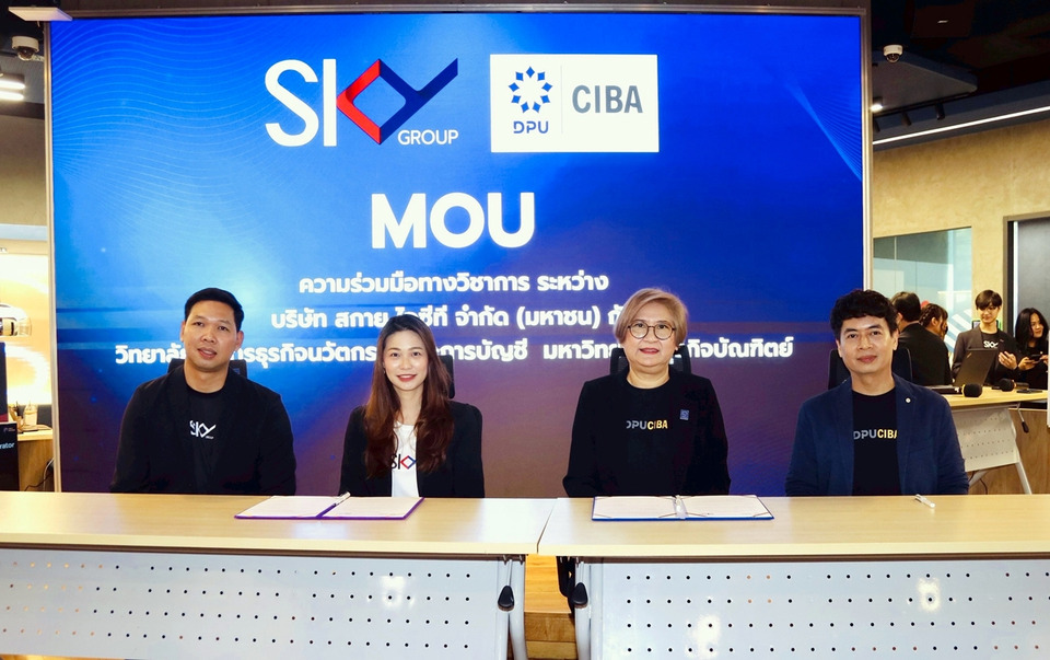 วิทยาลัยบริหารธุรกิจนวัตกรรมและการบัญชี (CIBA) มหาวิทยาลัยธุรกิจบัณฑิตย์ (DPU) ลงนามบันทึกความร่วมมือ (MOU) กับบริษัท สกาย ไอซีที จำกัด (มหาชน) หรือ SKY ICT ผู้นำด้าน IT Solution ของประเทศ เพื่อสนับสนุนการศึกษา ฝึกงาน และการพัฒนาทักษะด้านดิจิทัลให้นักศึกษา DPU โดยมีอาจารย์วสุกานต์ วิศาลสวัสดิ์ คณบดี CIBA และคุณหญิง จิตติพัฒนกุลชัย ประธานเจ้าหน้าที่สายงานบริการ กลุ่มบริษัทสกาย ร่วมลงนาม ท่ามกลางผู้บริหาร คณาจารย์ และนักศึกษา DPU ร่วมเป็นสักขีพยาน ณ สำนักงานใหญ่ SKY ICT