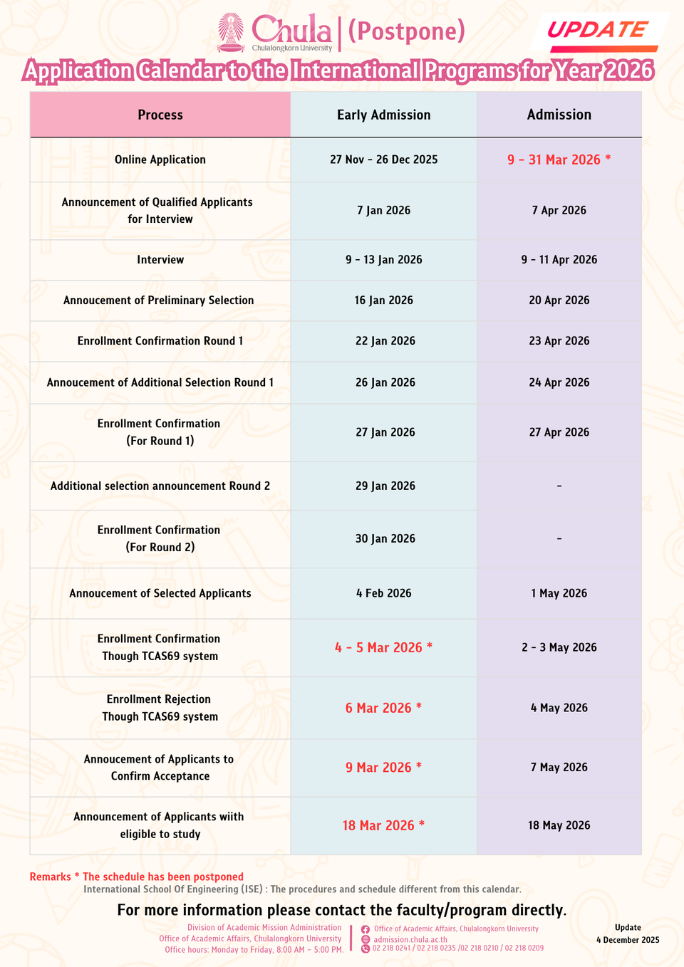 จุฬาลงกรณ์มหาวิทยาลัยเปลี่ยนแปลงกำหนดการรับสมัครและคัดเลือกนักเรียนเข้าศึกษาในจุฬาลงกรณ์มหาวิทยาลัย ระดับปริญญาตรี ปีการศึกษา 2569 (TCAS69) รอบที่ 1 แฟ้มสะสมผลงาน (Portfolio) รอบที่ 2 โควตา (Quota) ในหลักสูตรปกติ และรอบ Early Admission รอบ Admission ในหลักสูตรนานาชาติ เนื่องจากสถานการณ์อุทกภัยภาคใต้ ตามมติของที่ประชุมอธิการบดีแห่งประเทศไทย (ทปอ.) ดังนี้