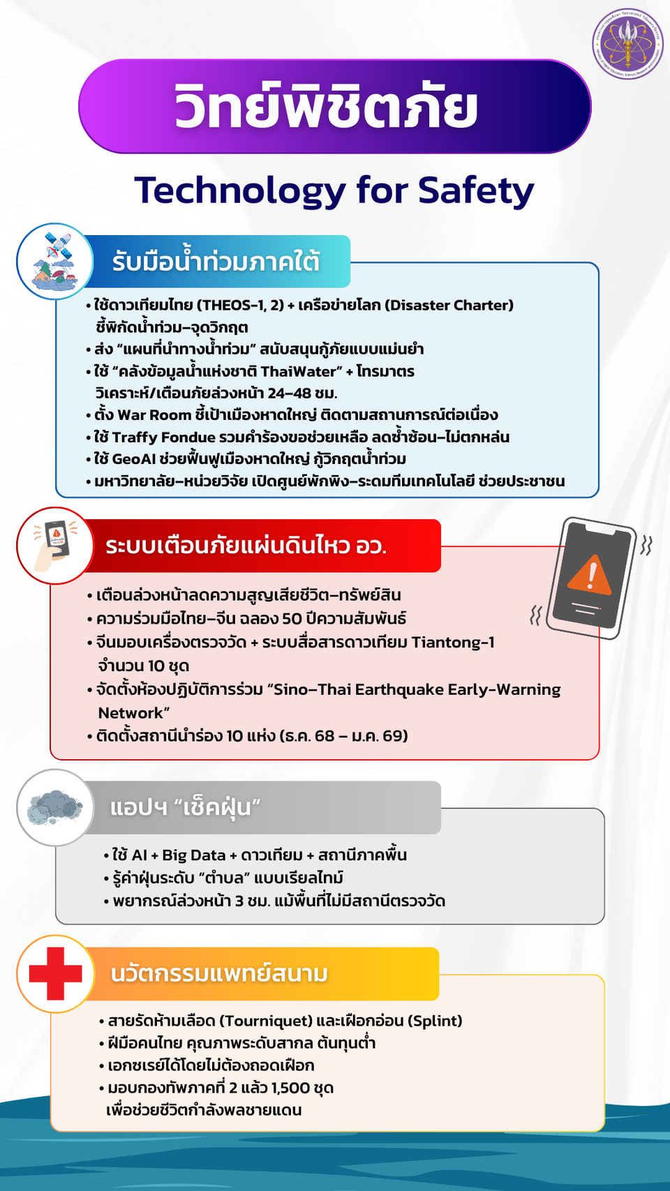 รมว.อว.กล่าวต่อว่า กลุ่มที่สอง “วิทย์พิชิตภัย” ในสถานการณ์น้ำท่วมภาคใต้ ตนได้สั่งการให้จิสด้าใช้ดาวเทียมธีออส 1 และธีออส 2 รวมทั้งเครือข่ายโลก (Disaster Charter) ชี้พิกัดน้ำท่วม–จุดวิกฤตพร้อมกับส่ง “แผนที่นำทางน้ำท่วม” สนับสนุนการกู้ภัยแบบแม่นยำ ขณะเดียวกันให้ สสน. ใช้ “คลังข้อมูลน้ำแห่งชาติ ThaiWater” และ โทรมาตร วิเคราะห์/เตือนภัยล่วงหน้า 24–48 ชม.พร้อมจัดตั้ง War Room ชี้เป้าเมืองหาดใหญ่เพื่อติดตามสถานการณ์ต่อเนื่องทั้งในช่วงน้ำท่วมและช่วงการฟื้นฟูนอกจากนี้ ยังใช้ Traffy Fondue รวมคำร้องขอช่วยเหลือ เพื่อลดซ้ำซ้อนและไม่ให้มีการตกหล่นความช่วยเหลือจากภาครัฐ รวมทั้งใช้ GeoAI ช่วยฟื้นฟูเมืองหาดใหญ่ กู้วิกฤตน้ำท่วม และยังระดมทีมเทคโนโลยีให้การช่วยประชาชน