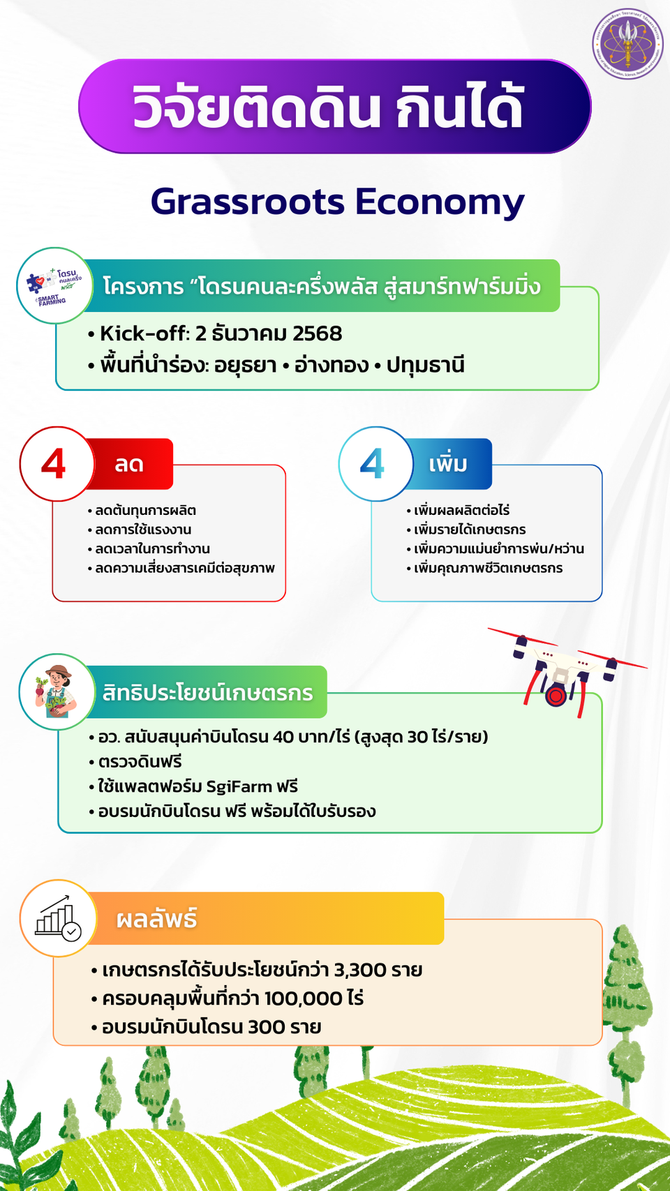 นายสุรศักดิ์ กล่าวว่า หลังจากที่ตนได้แถลงนโยบายเมื่อครั้งเข้ารับตำแหน่ง รมว.กระทรวง อว.เมื่อวันที่ 6 ต.ค.2568 ที่ผ่านมาว่าจะเร่งดำเนินนโยบาย Quick Win เพื่อให้เกิดผลงานเป็นรูปธรรมแก่ประชาชนโดยเร็วที่สุดและจนถึงวันนี้ครบ 2 เดือนหรือ 60 วันพอดี ตนได้ทำตามนโยบาย Quick Win ที่ประกาศไว้สำเร็จ โดยขอแบ่งเป็น 5 กลุ่ม กลุ่มแรก “วิจัยติดดิน กินได้” โดยดำเนินโครงการ “โดรนคนละครึ่งพลัส สู่สมาร์ทฟาร์มมิ่ง” เพื่อช่วยเหลือภาคเกษตรกรรม ซึ่งเป็นคนส่วนใหญ่ของประเทศ ให้ได้ประโยชน์ 4 ลด คือลดต้นทุนการผลิต – ลดการใช้แรงงาน - ลดเวลาในการทำงาน – ลดความเสี่ยงสารเคมีต่อสุขภาพและ 4 เพิ่ม คือเพิ่มผลผลิตต่อไร่ - เพิ่มรายได้เกษตรกร - เพิ่มความแม่นยำในการพ่น/หว่าน – เพิ่มคุณภาพชีวิตเกษตรกร โครงการโดรนคนละครึ่งพลัสฯ เปิดตัวไปเมื่อวันที่ 2 ธ.ค.ที่ผ่านมา นำร่องใน 3 จังหวัด คือพระนครอยุธยา อ่างทองและปทุมธานี มีเกษตรกรได้รับประโยชน์กว่า 3,300 ราย ครอบคลุมพื้นที่ 1 แสนไร่