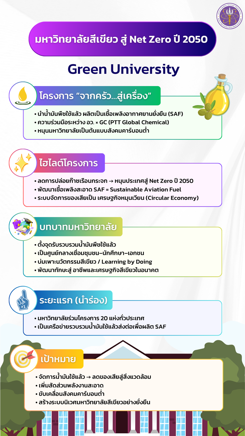 กลุ่มที่สาม “มหาวิทยาลัยสีเขียวสู่ Net Zero ปี 2050” โดยดำเนินการโครงการ “จากครัว…สู่เครื่อง” ด้วยการนำน้ำมันพืชที่ใช้แล้วมาผลิตเป็นเชื้อเพลิงอากาศยานแบบยั่งยืนร่วมกับ บริษัท พีทีที โกลบอล เคมิคอล จำกัด (มหาชน) (GC) โดยมีเป้าหมายให้มหาวิทยาลัยทั่วประเทศเป็นกลไกสำคัญและเป็นต้นแบบในการจัดการที่เป็นมิตรต่อสิ่งแวดล้อม ทั้งนี้ กระทรวง อว.ได้สนับสนุนการตั้งจุดรวบรวมน้ำมันพืชใช้แล้วในมหาวิทยาลัยนำร่องกว่า 20 แห่งทั่วประเทศมาผลิตเป็นเชื้อเพลิงอากาศยาน